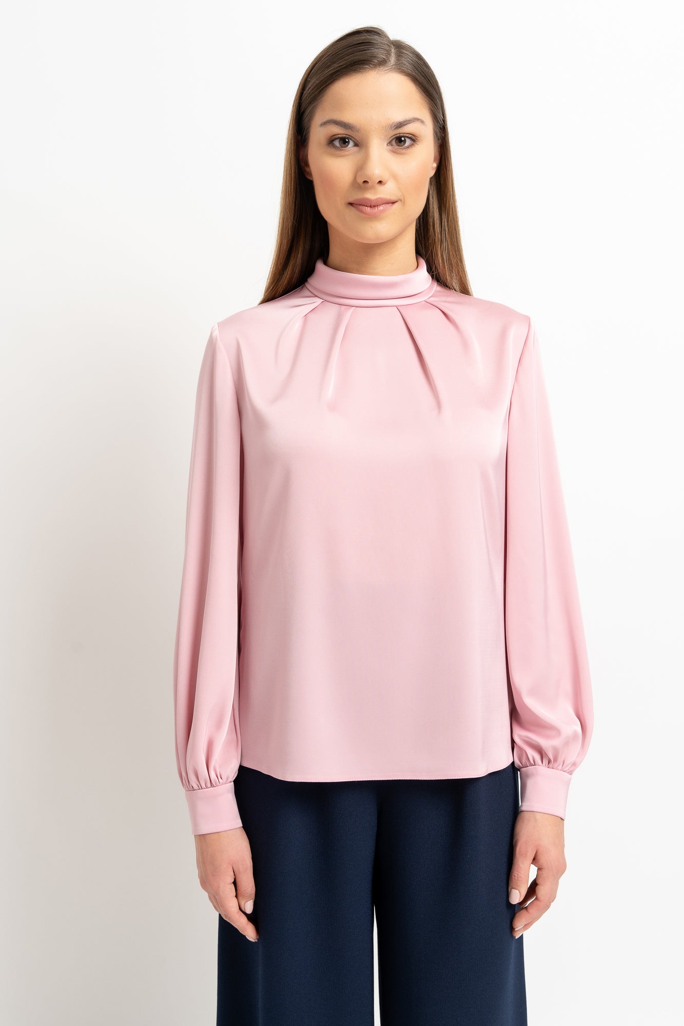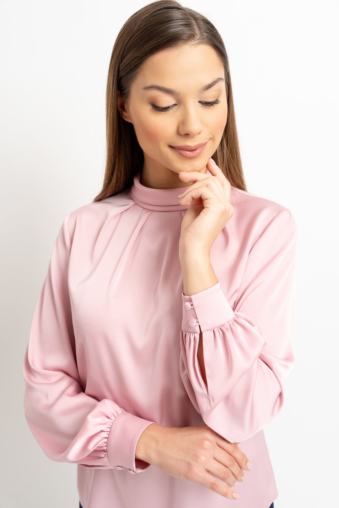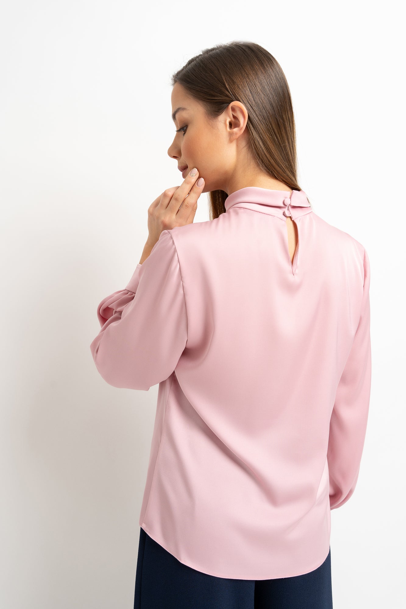Diese puderrosa Bluse aus weichem Satin mit edlem Perlglanz ist der Inbegriff dezenten Luxus. Der Umlegekragen, dezent verziert mit vier Falten um die Naht, verleiht ein raffiniertes, architektonisches Design, während eine kleine Träne auf der Rückseite, befestigt mit bezogenen Knöpfen, einen Hauch von Raffinesse verleiht. Mehrfache Knöpfe an den breiten Manschetten und stark gerafften Ärmeln verleihen Volumen und einen Hauch von Bohème. Der entspannte Schnitt sorgt für Tragekomfort und lässt die Bluse harmonisch zu eleganten Abend- und Business-Outfits passen, egal ob über oder unter Hose oder Rock getragen.