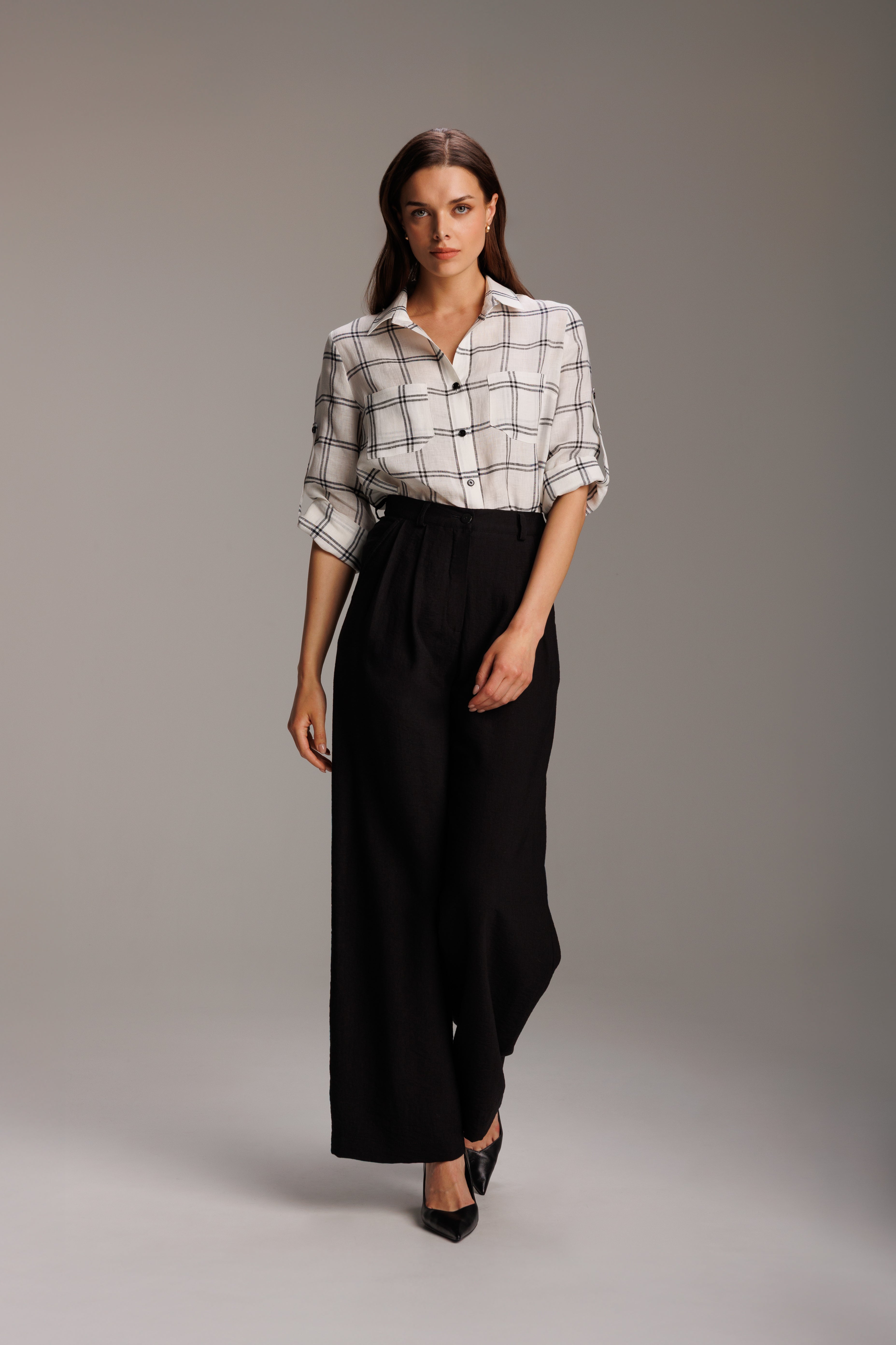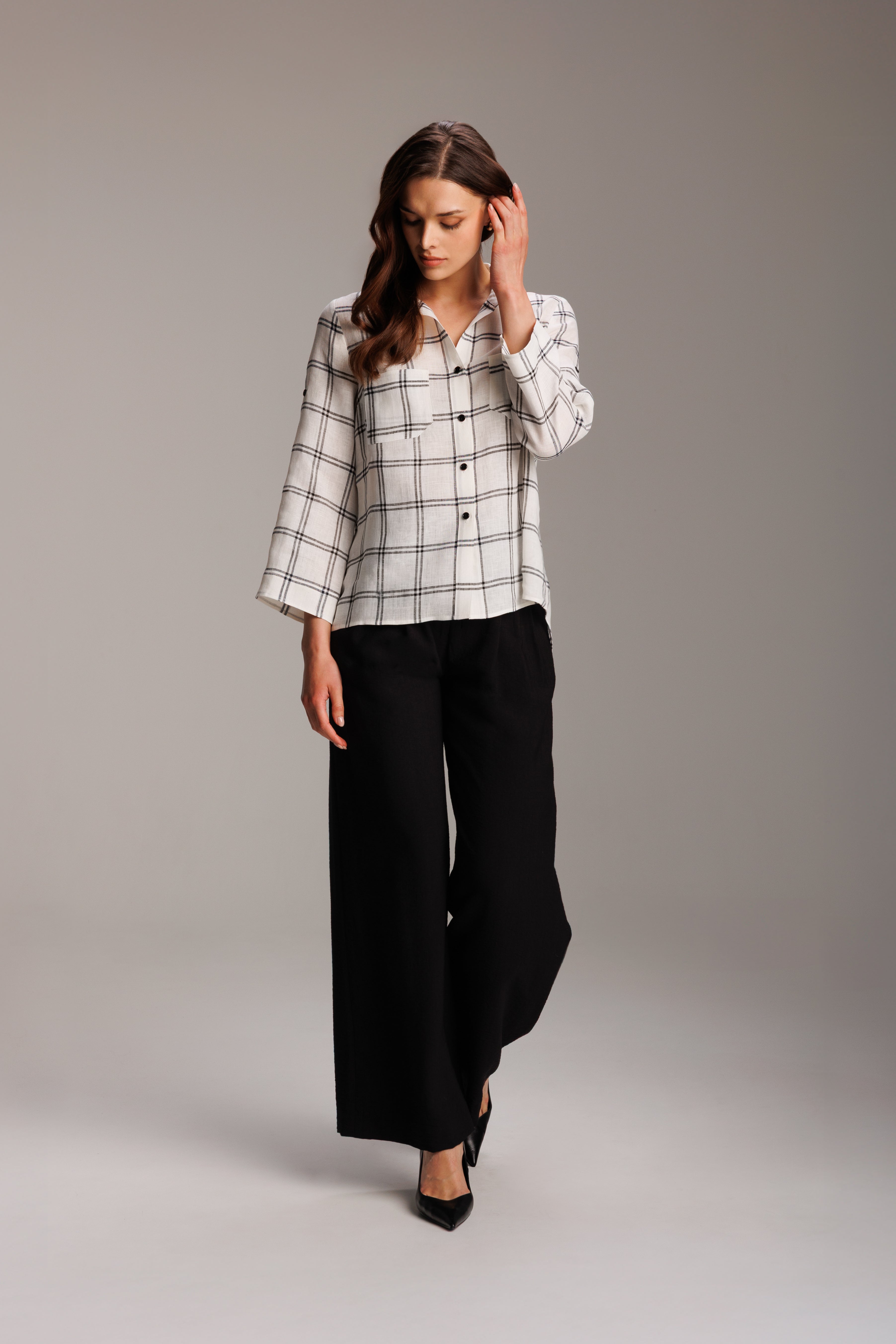 Diese Leinenbluse mit markantem, zweifarbigem Karomuster ist der Inbegriff sommerlicher Lässigkeit, eingefangen in geometrischer Harmonie. Der natürliche, atmungsaktive Stoff sorgt auch an heißen Tagen für Komfort, und der minimalistische Schnitt sorgt dafür, dass sie zu jeder Jahreszeit aktuell bleibt. Das Modell verfügt über funktionale, verstellbare Ärmel; einfach hochkrempeln und mit einem Knopf schließen – für einen lässigeren, luftigeren Tragekomfort. Zwei symmetrische Brusttaschen verleihen einen Hauch von sportlichem Flair, und die dezente Karofarbe sorgt für ein unkompliziertes Styling: sowohl mit Leinenhosen als auch mit klassischen Jeans. Perfekt für den Alltag und auf Reisen – sie vermittelt stets ein Gefühl von Leichtigkeit und natürlicher Eleganz.