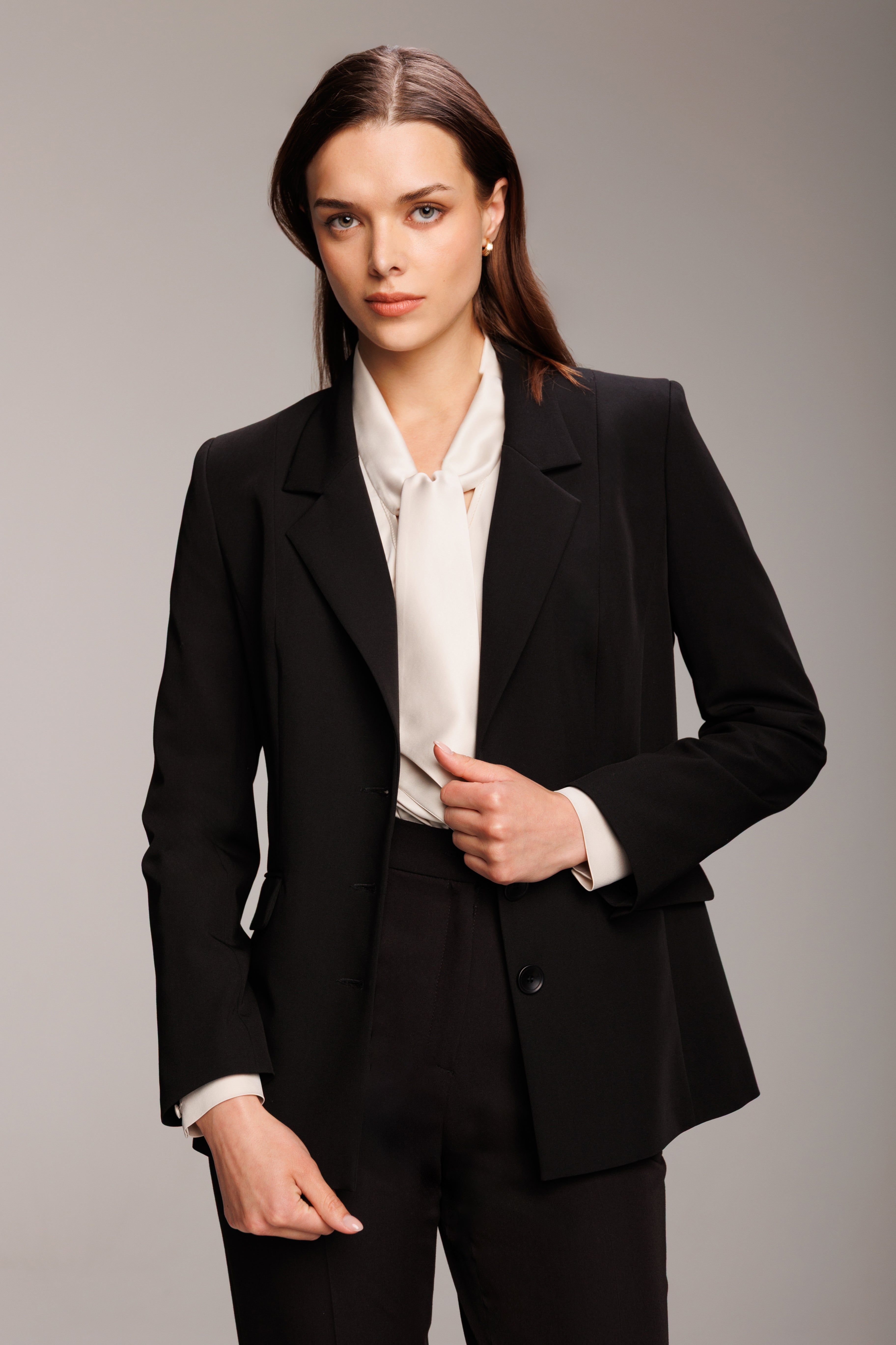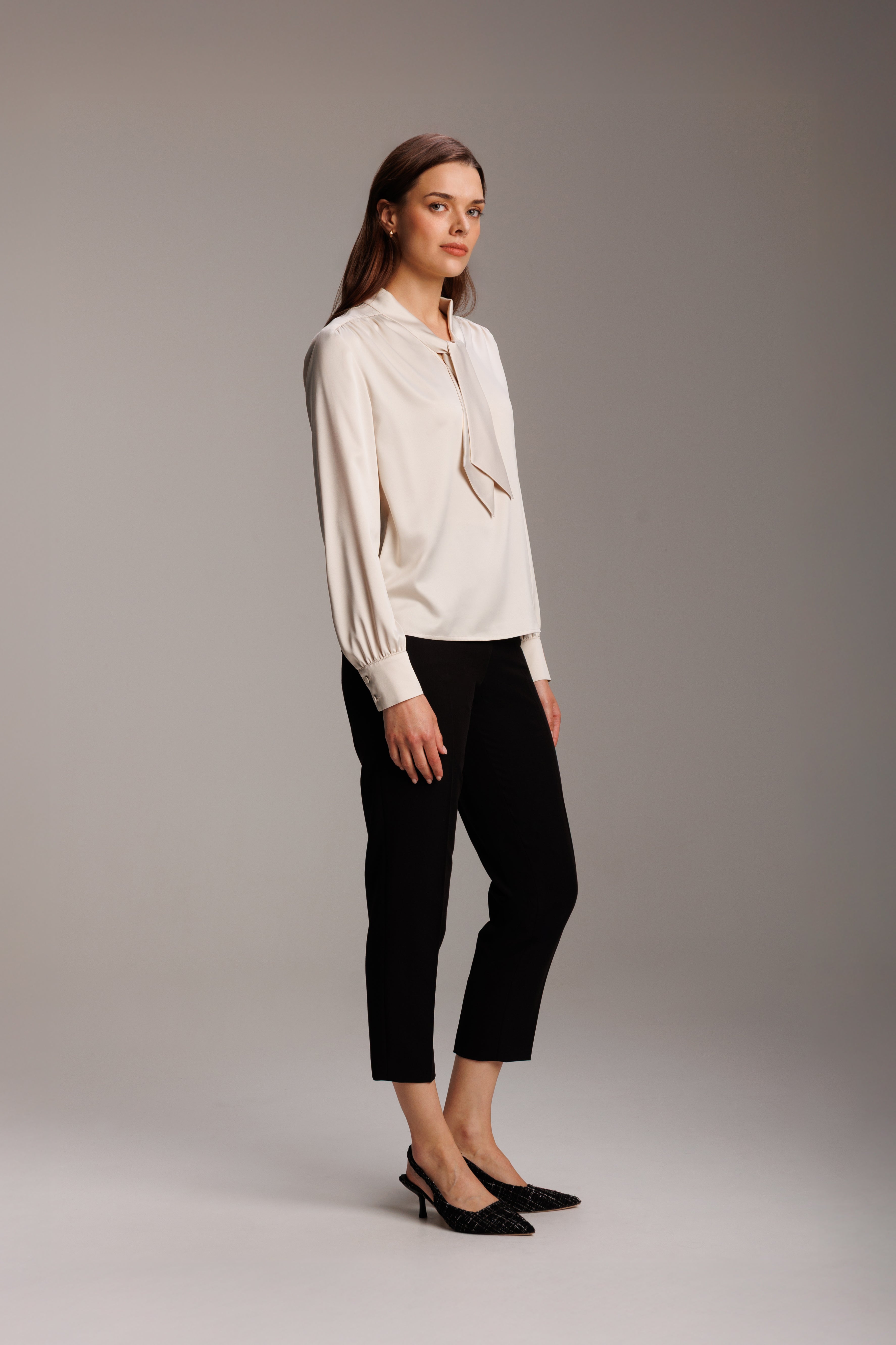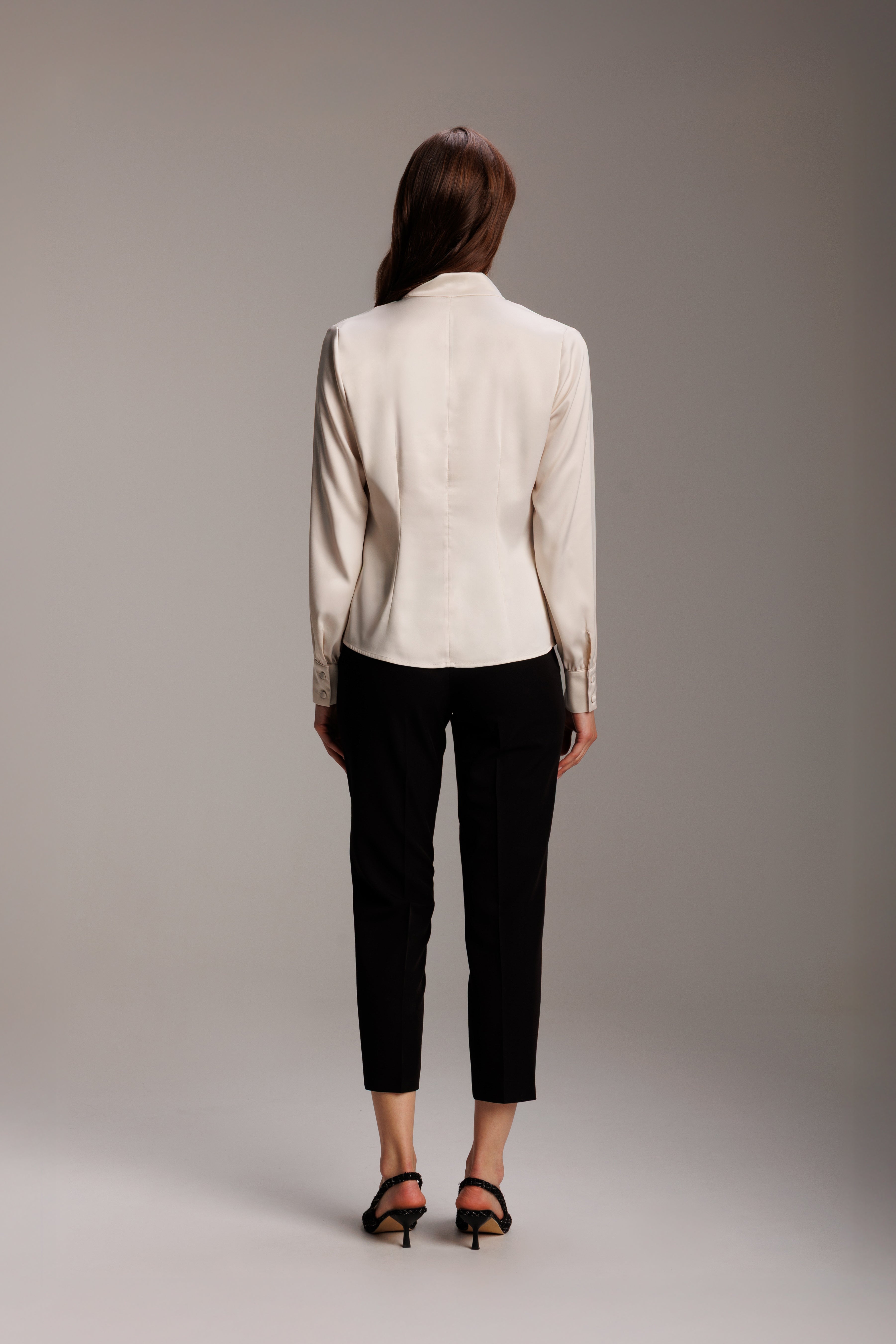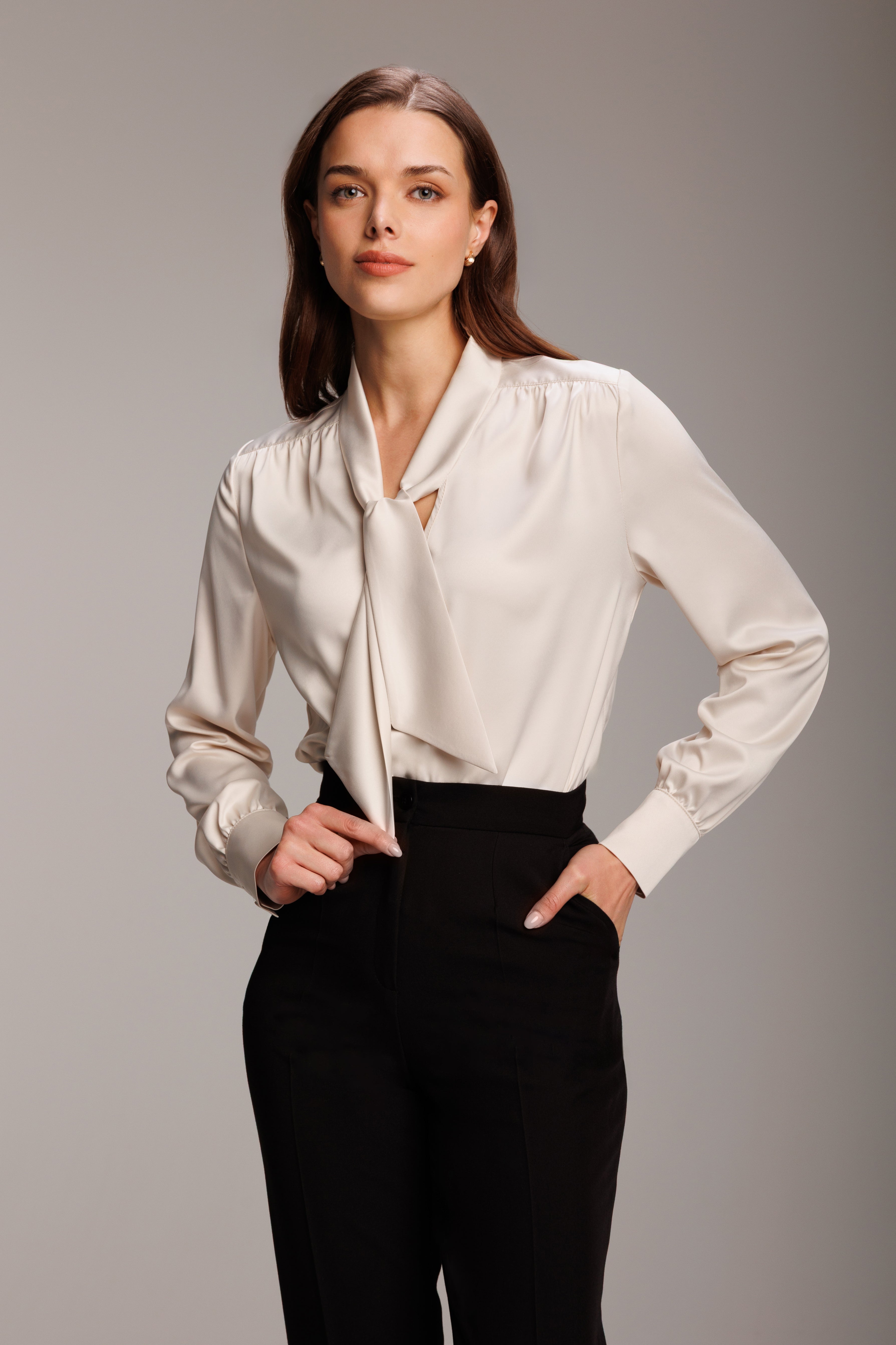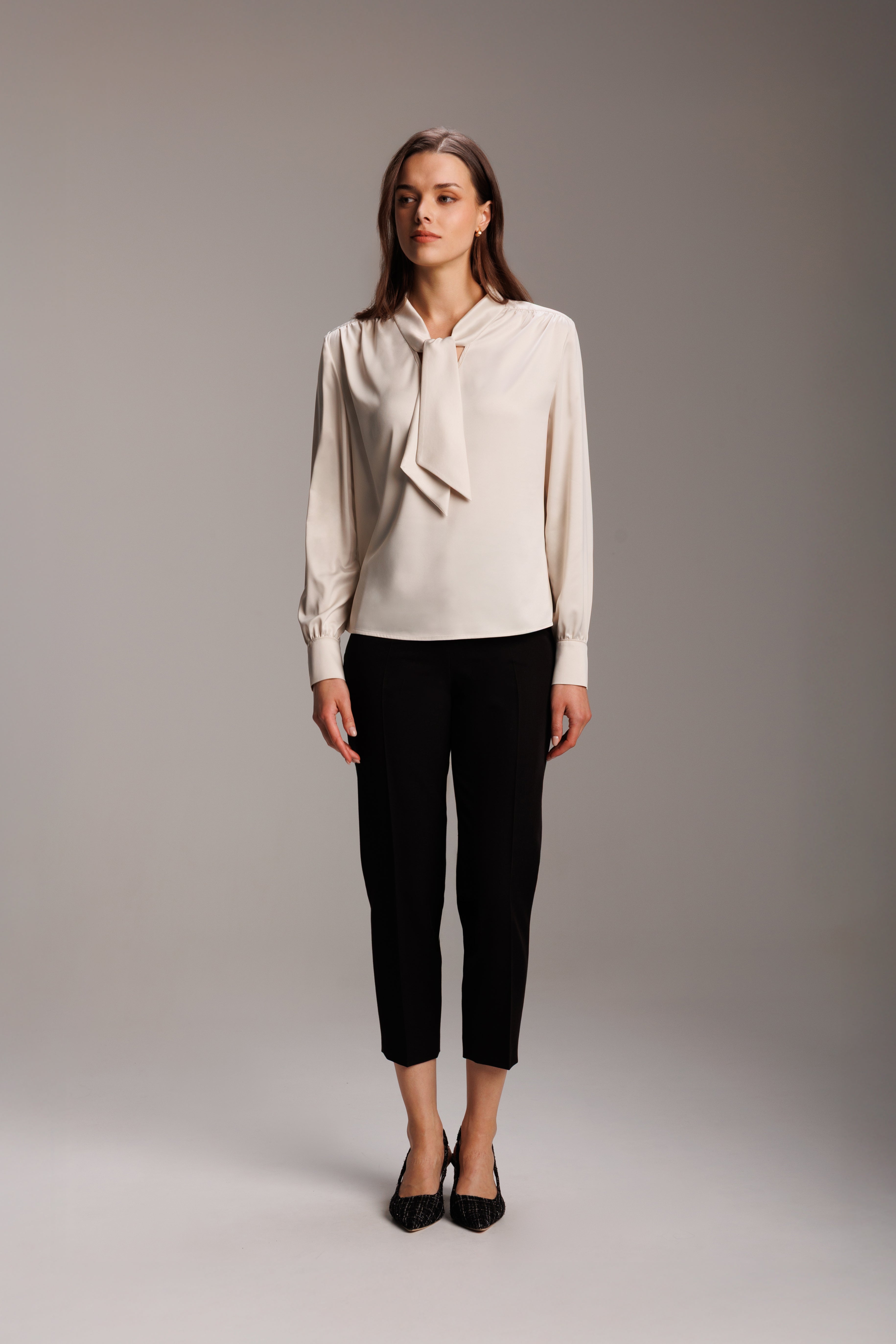 Das Herzstück des Designs ist der Ausschnitt, der mit einer dekorativen Schärpe versehen ist, die einen anmutigen Akzent setzt und individuelles Styling ermöglicht. Sie kann für einen romantischen Touch zu einer Schleife gebunden, zu einem Knoten gebunden oder für einen natürlichen, luftigen Effekt locker getragen werden. Dezente Raffungen an den Schultern sorgen für Leichtigkeit und Bewegung, während die mit Stoffknöpfen befestigten Manschetten an klassische Schneiderkunst in ihrer elegantesten Form erinnern.