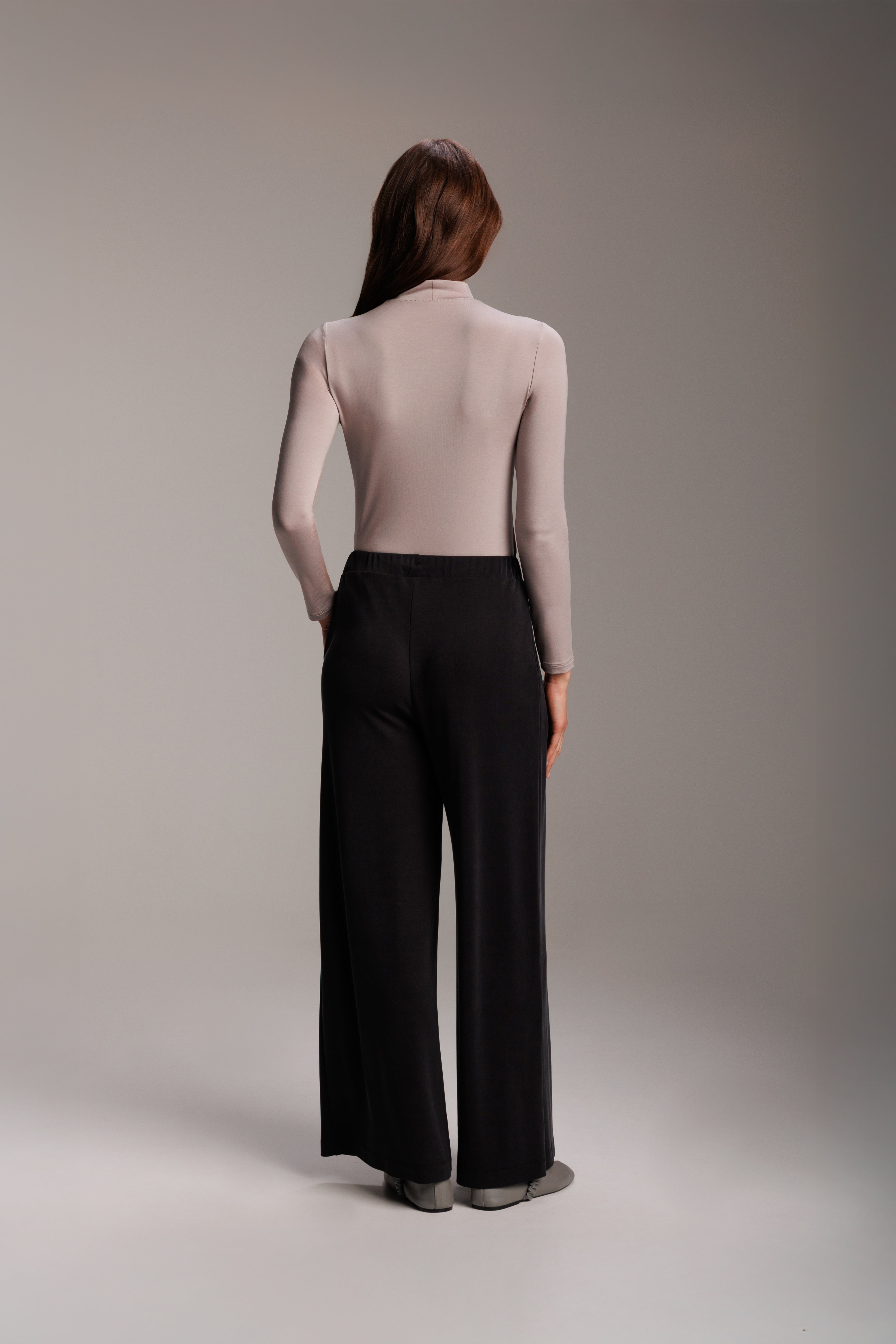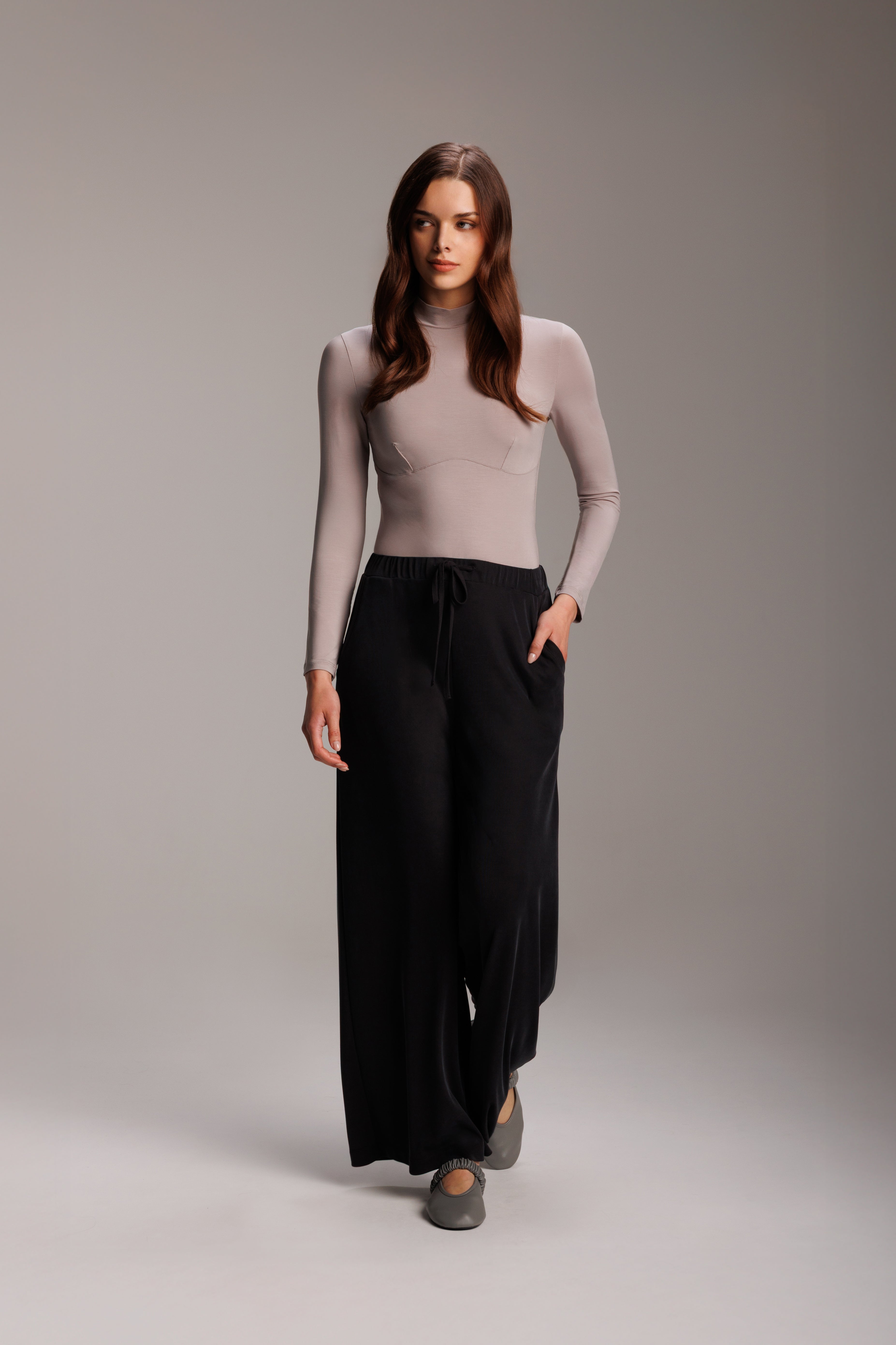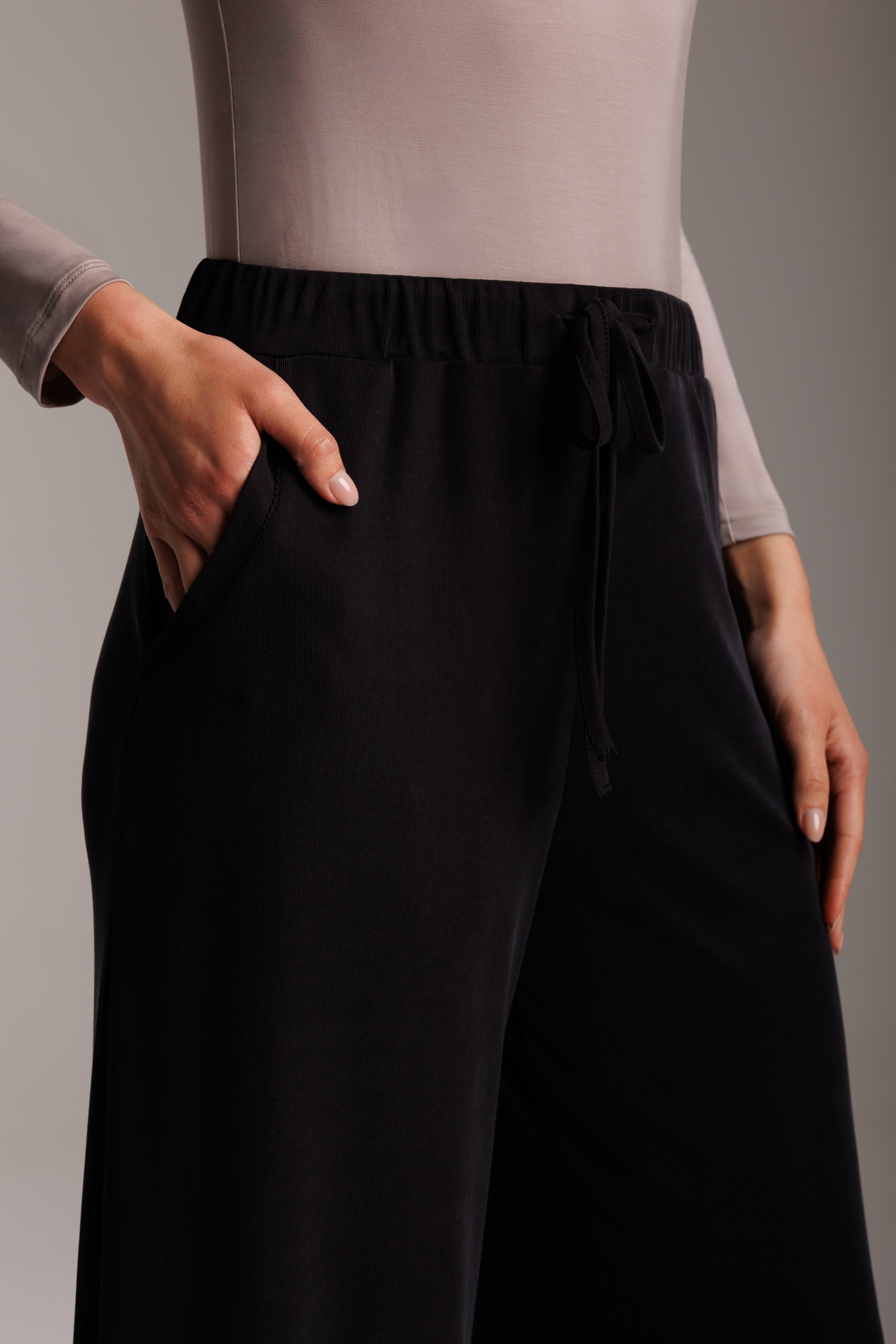 Die Lerra-Hose ist die Antwort auf Ihr tägliches Bedürfnis nach Komfort und Bequemlichkeit. Weicher, dehnbarer Stoff umhüllt sanft Ihre Figur, während weite Beine für volle Bewegungsfreiheit und ein natürliches, leichtes Tragegefühl sorgen. Egal in welchem Tempo oder zu welchem Anlass : Der elastische Bund mit Bindeband sorgt nicht nur für einen bequemen Sitz, sondern betont auch die Taille und verleiht eine harmonische Silhouette. Es ist ein Detail, das Funktionalität mit Ästhetik verbindet und so charakteristisch für moderne Designs im Geiste müheloser Eleganz ist.
