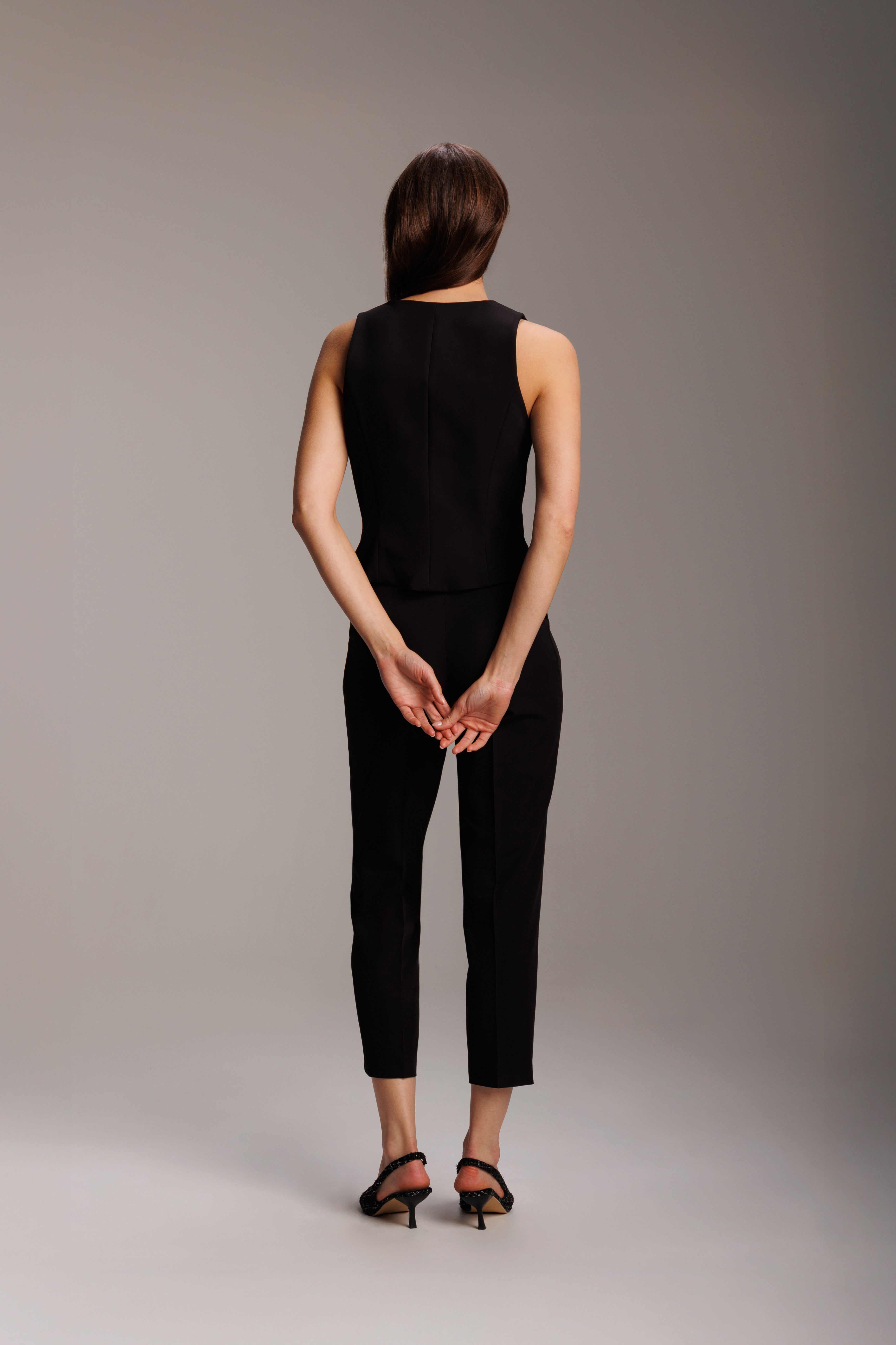 The Finezza vest is a nod to classic style with a subtle touch of modernity. Carefully tailored, it beautifully shapes the silhouette thanks to its waistband and contouring cuts that smoothly accentuate the back. The deep V-neck visually slims the figure, highlighting the neck and upper body, while the symmetrical hemline lends a slightly geometric character. The button placket and imitation slatted pockets add a touch of elegance, while the refined, flowing fabric with a subtle texture introduces a sense of elegant minimalism. This wardrobe piece works well with a fitted shirt or on its own, as a sophisticated accent to a modern suit. It pairs perfectly with Nera trousers made from the same fabric.