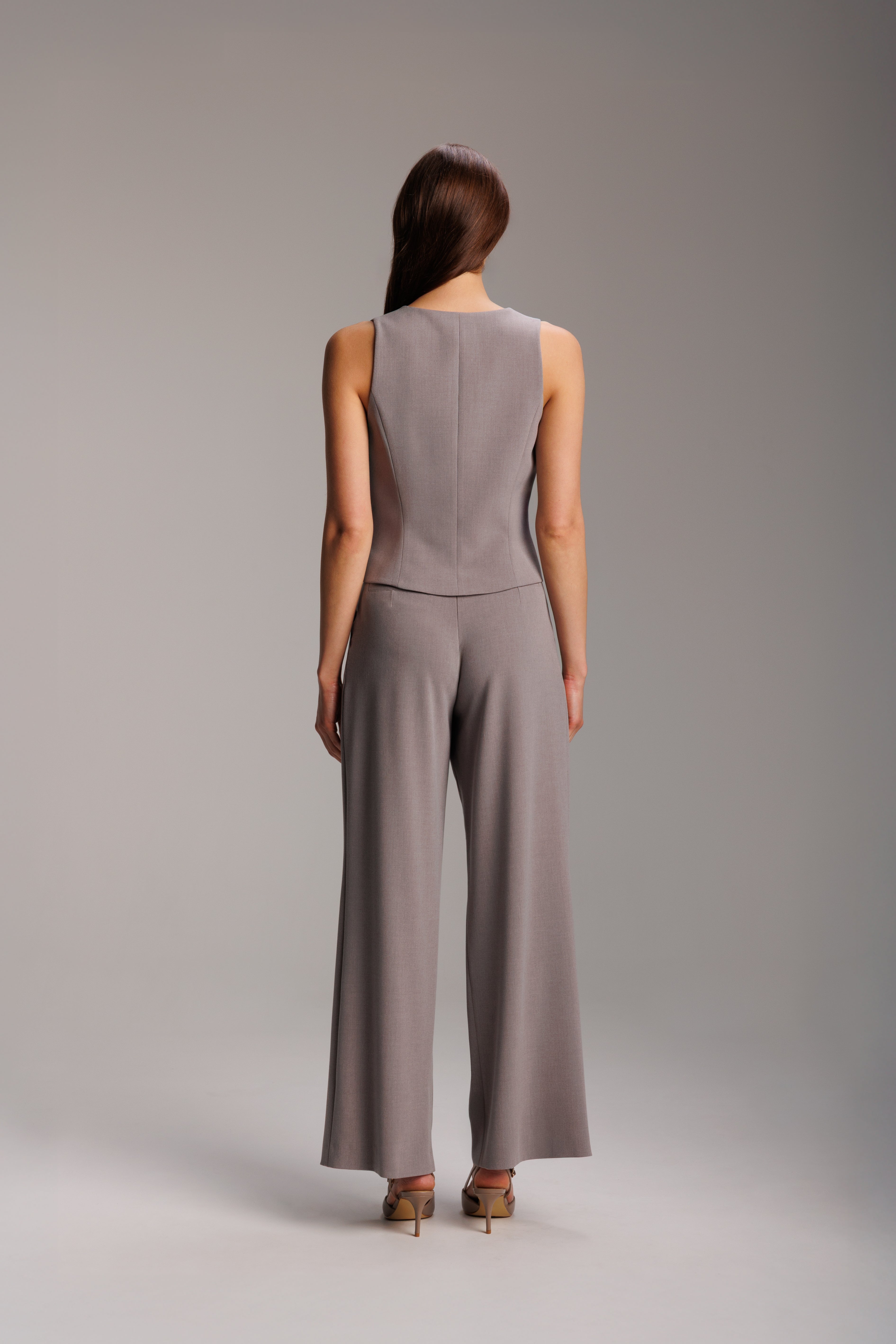 The Finezza vest is a nod to classic style with a subtle touch of modernity. Carefully tailored, it beautifully shapes the silhouette thanks to its waistband and contouring cuts that smoothly accentuate the back. The deep V-neck visually slims the figure, highlighting the neck and upper body, while the symmetrical hemline gives the piece a slightly geometric character. The button placket and imitation slatted pockets add a touch of elegance, while the refined, smooth fabric with a subtle texture creates a sense of elegant minimalism. This wardrobe piece works well with a fitted shirt or on its own, as a sophisticated accent to a modern suit. It pairs perfectly with Alta trousers made from the same fabric.