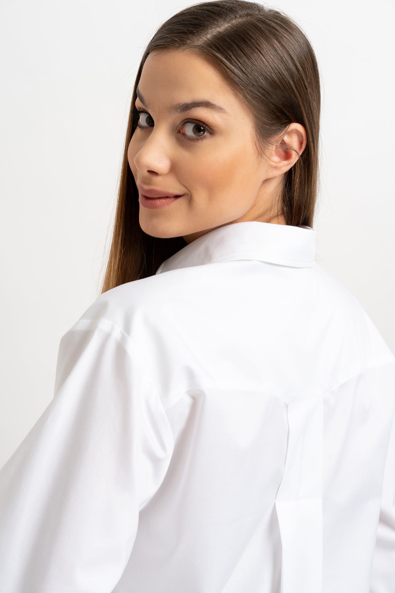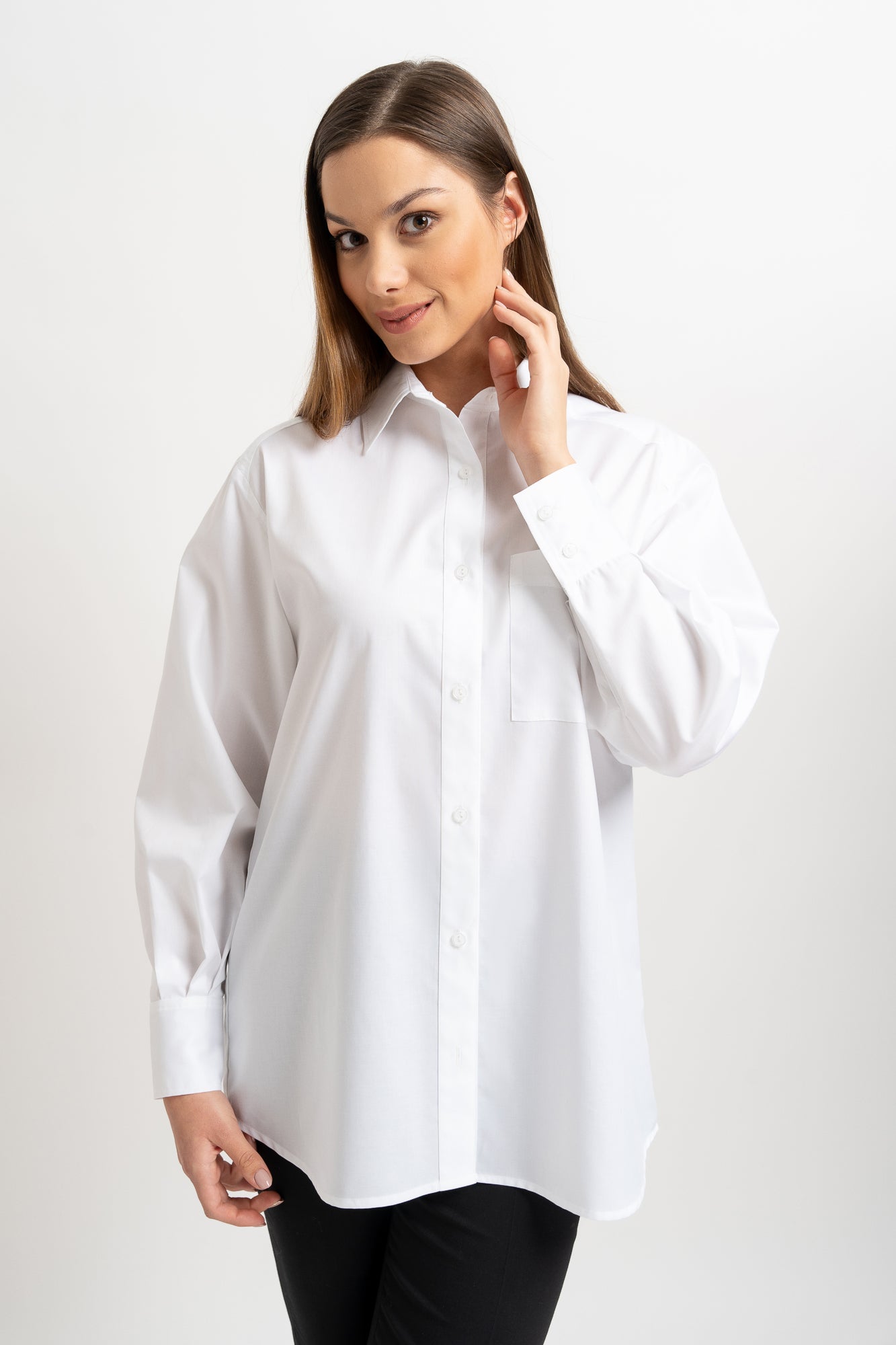 The Bianca shirt, with its classic stand-up collar, is the essence of everyday chic with a subtle, casual twist. Crafted from pure cotton, it captivates with its simple form and relaxed, slightly oversized fit. The gently dropped shoulders and classic yoke at the back are broken up by a box pleat, which not only adds volume but also flows beautifully with movement. A single chest pocket emphasizes the utilitarian nature of the design while maintaining its elegant understatement. This shirt works well with tailored trousers or casually layered over a top or bodysuit.