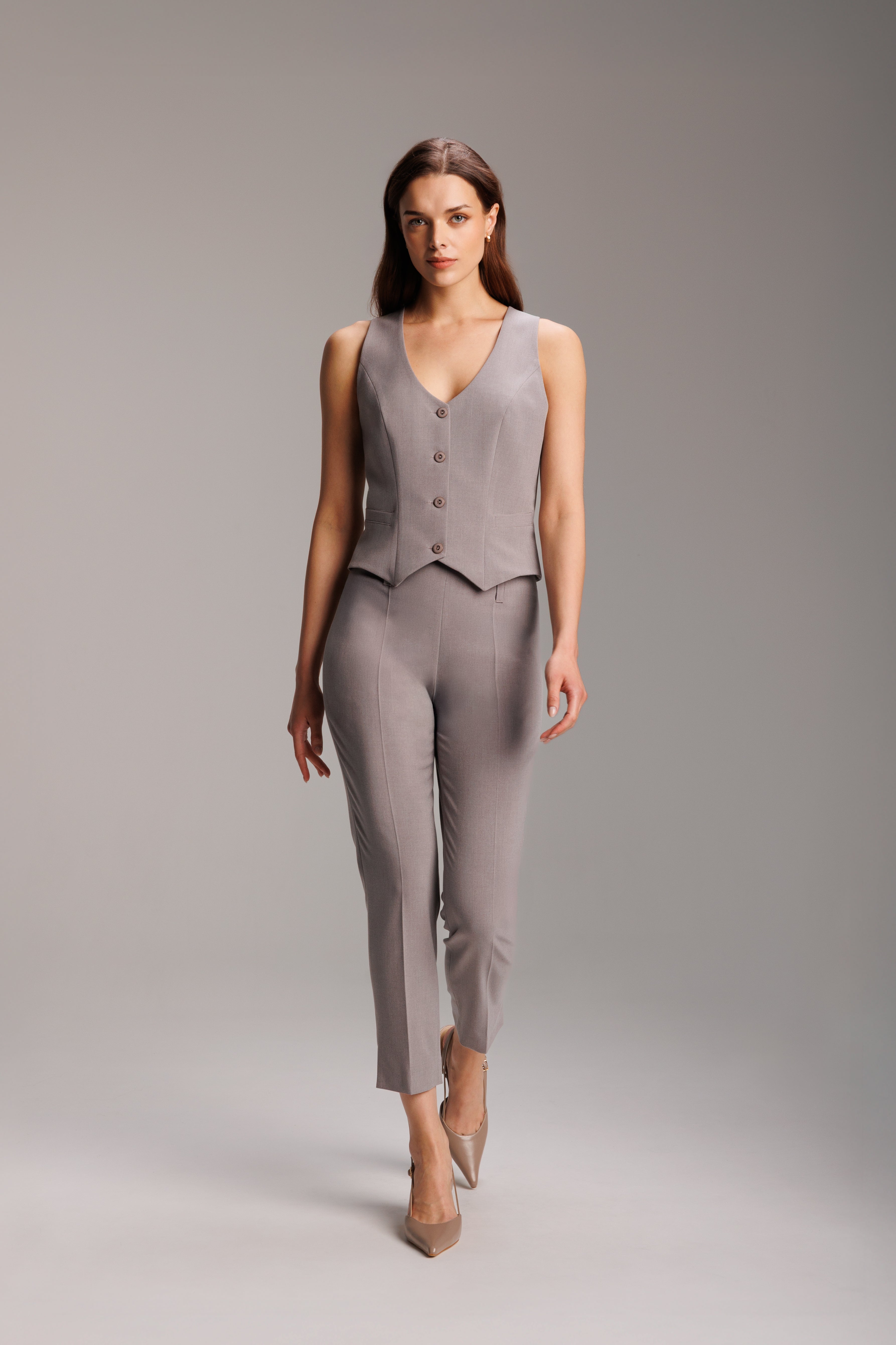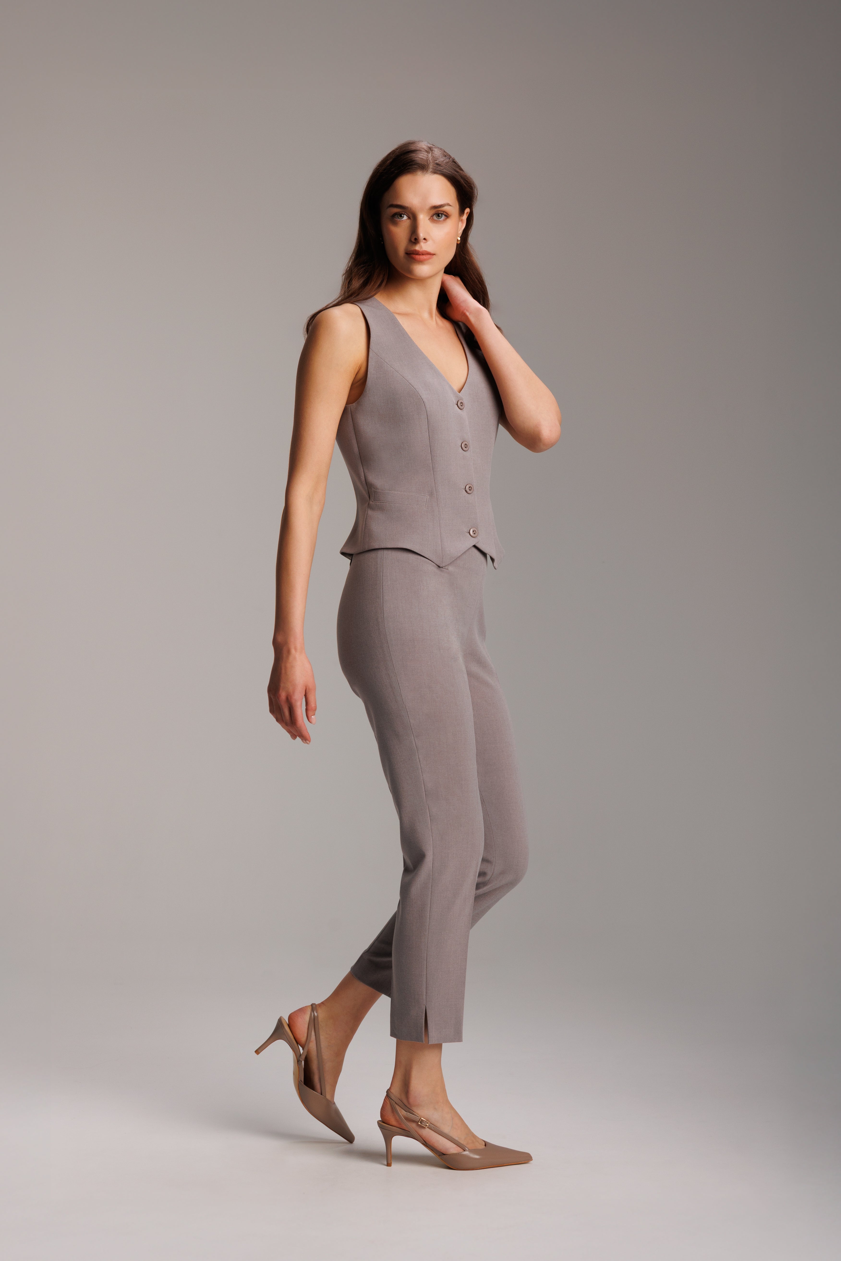 Elegant 7/8-length trousers crafted from smooth taupe fabric. The high waist beautifully accentuates the waist, while a concealed zipper closure at the back creates a sleek, clean front. The lack of pockets enhances the minimalist design, while carefully sewn-in belt loops allow for the addition of a belt to enhance the look's individuality. The creased legs slim the silhouette, and discreet side slits add a touch of lightness and freedom of movement. This style will easily complement both office ensembles and more elegant outfits.