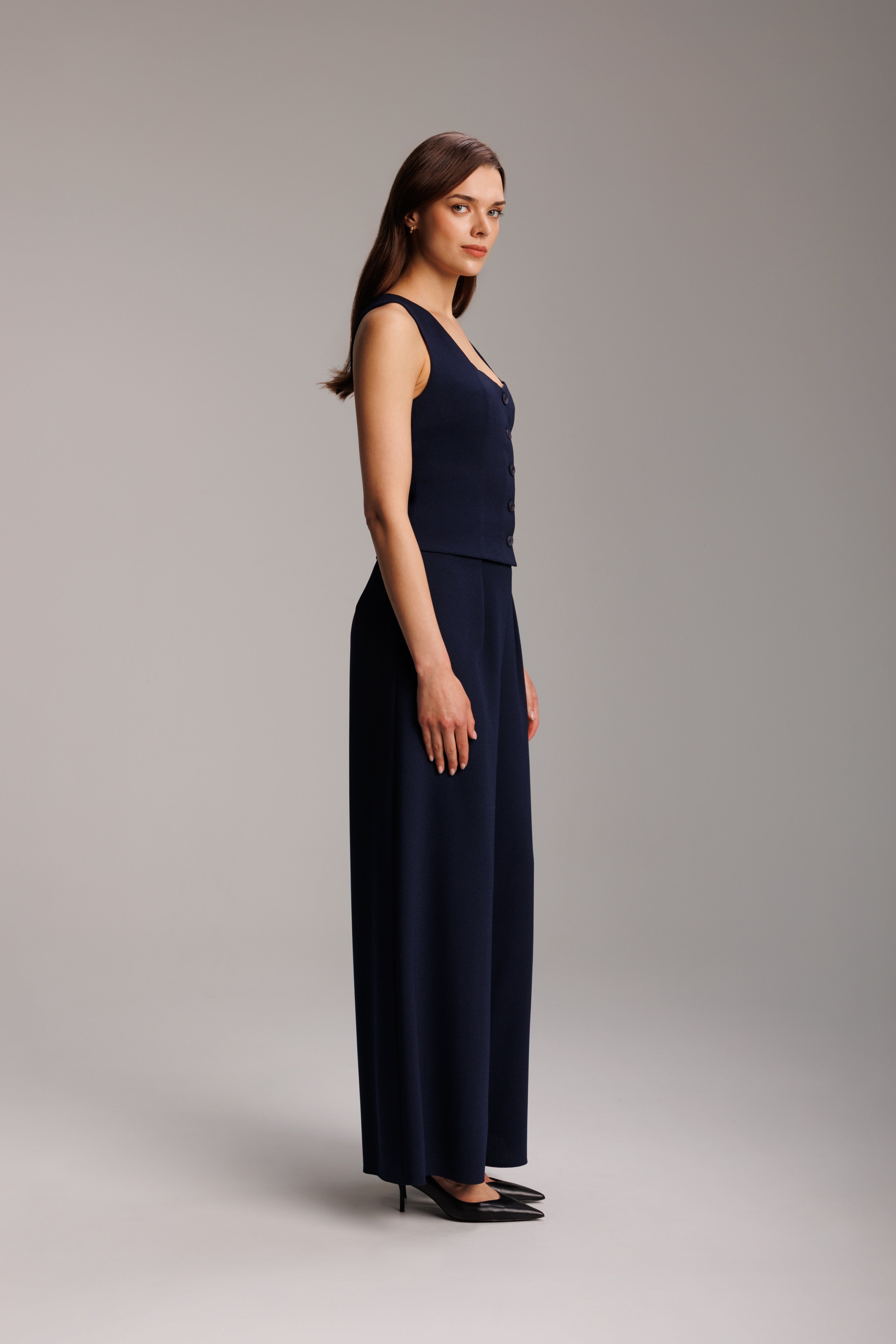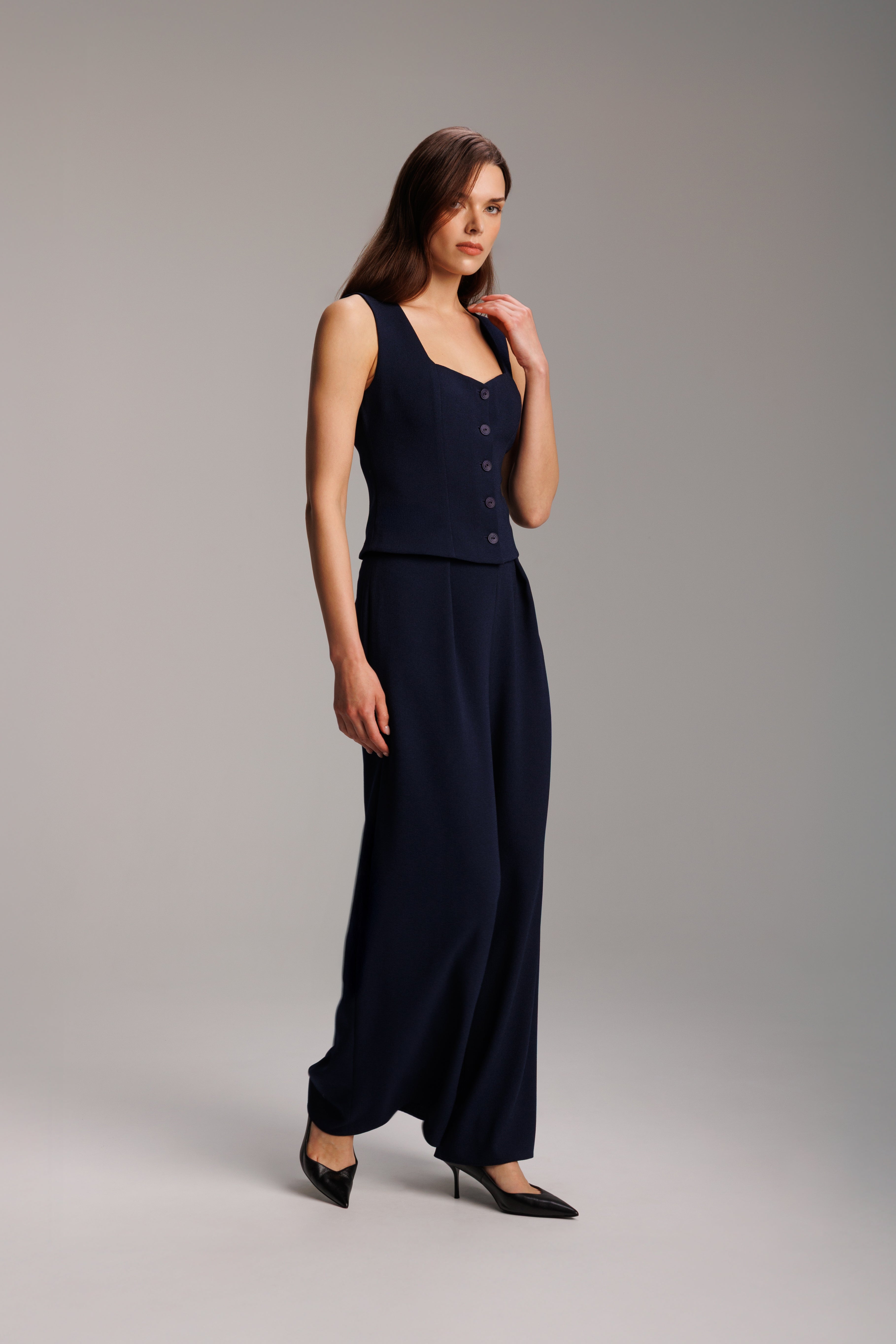 Palazzo Armonia trousers are available in three carefully selected colors: deep navy, elegant black, and creamy beige. These trousers are equally at home in professional settings as they are for an afternoon stroll or an evening meeting. Their strength lies in their versatility, and their elegance in their casual style.