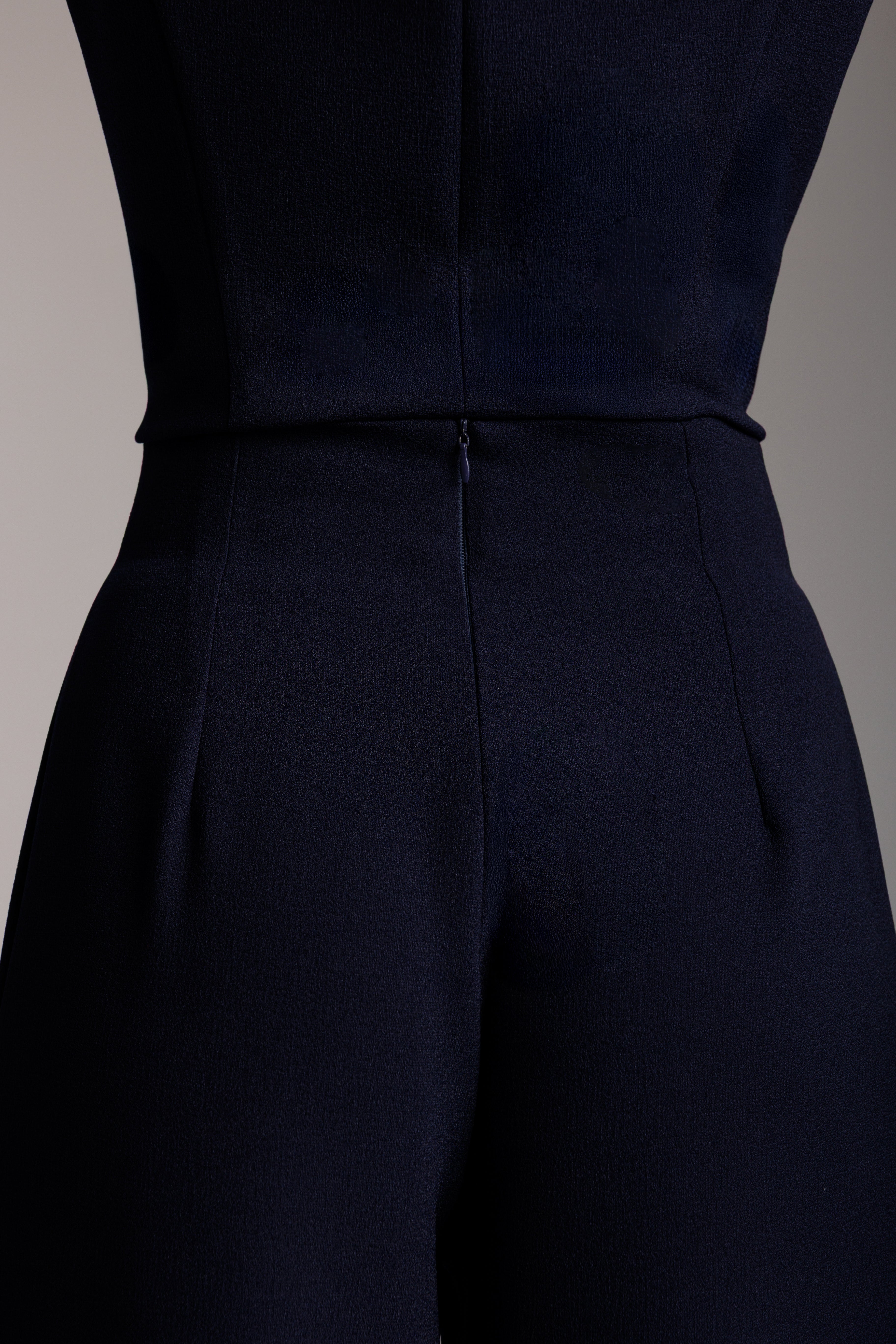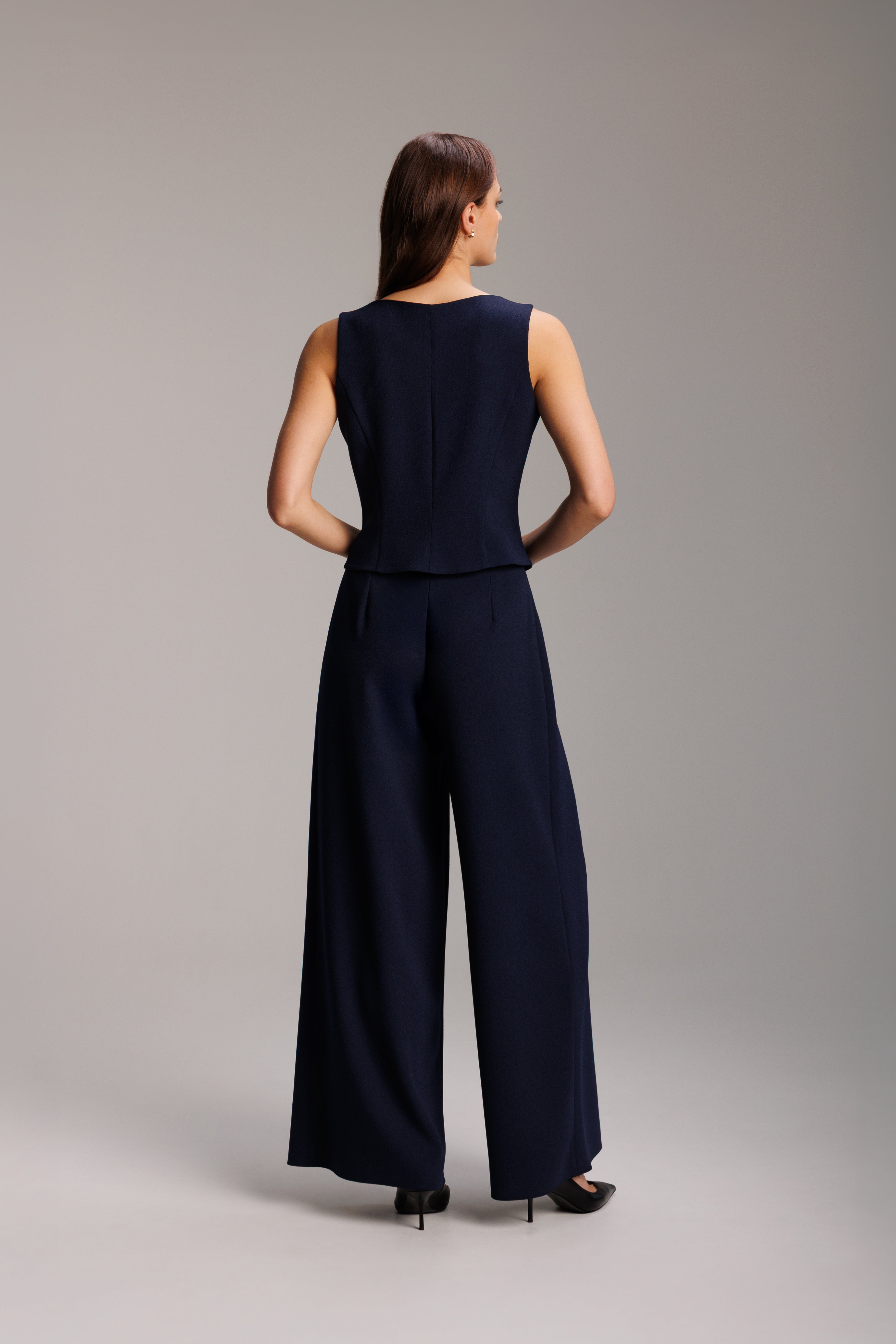The high waist, tightly fitted at the waist, beautifully accentuates the feminine lines, shaping proportions and visually elongating the legs. The pleats at the front add extra space, and the back zipper maintains the clean lines at the front, giving the trousers a truly refined look.