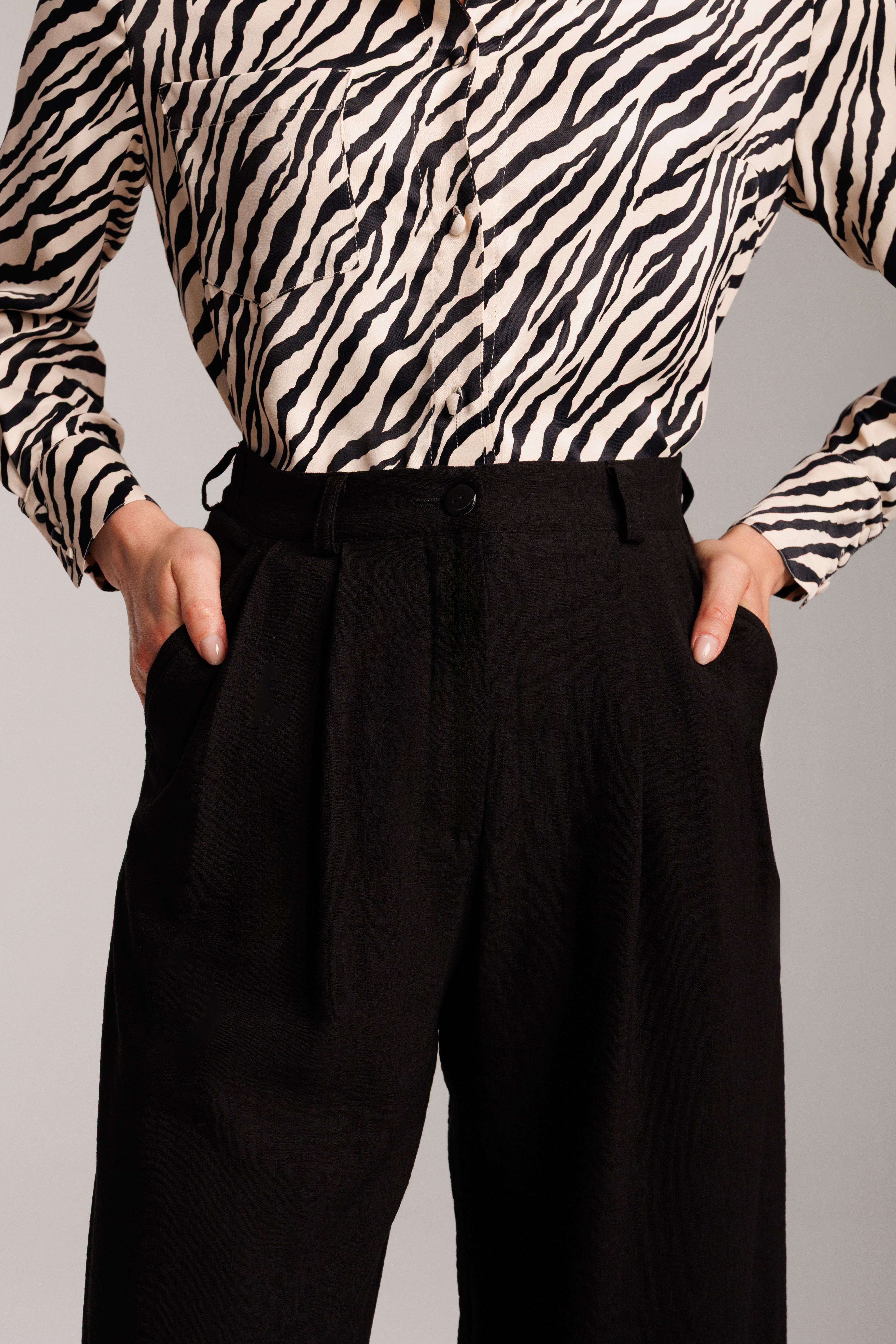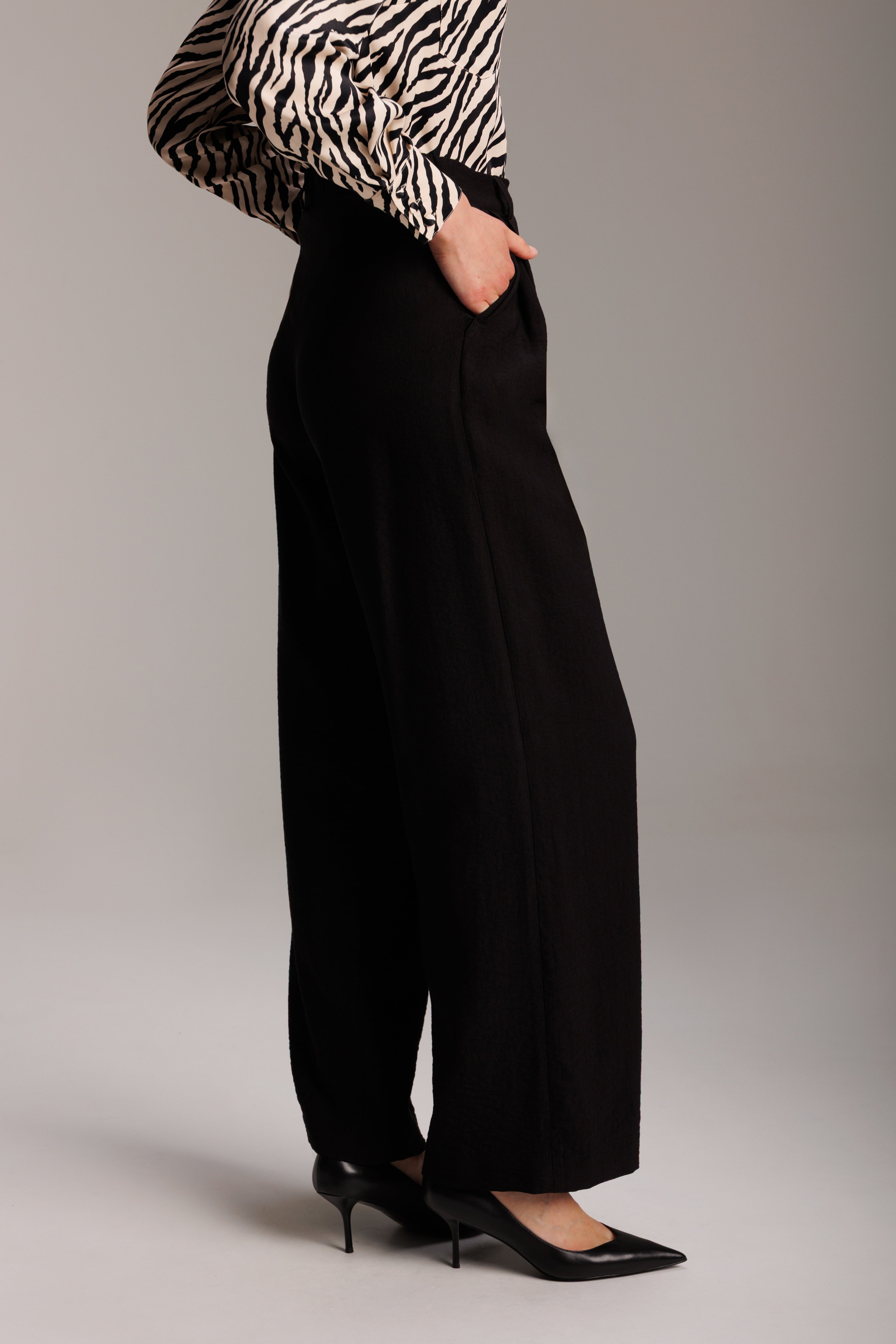 The model with elongated, straight legs has been designed with attention to detail: it has a belt with belt loops, pockets on the sides and delicate pleats that flow beautifully during movement.