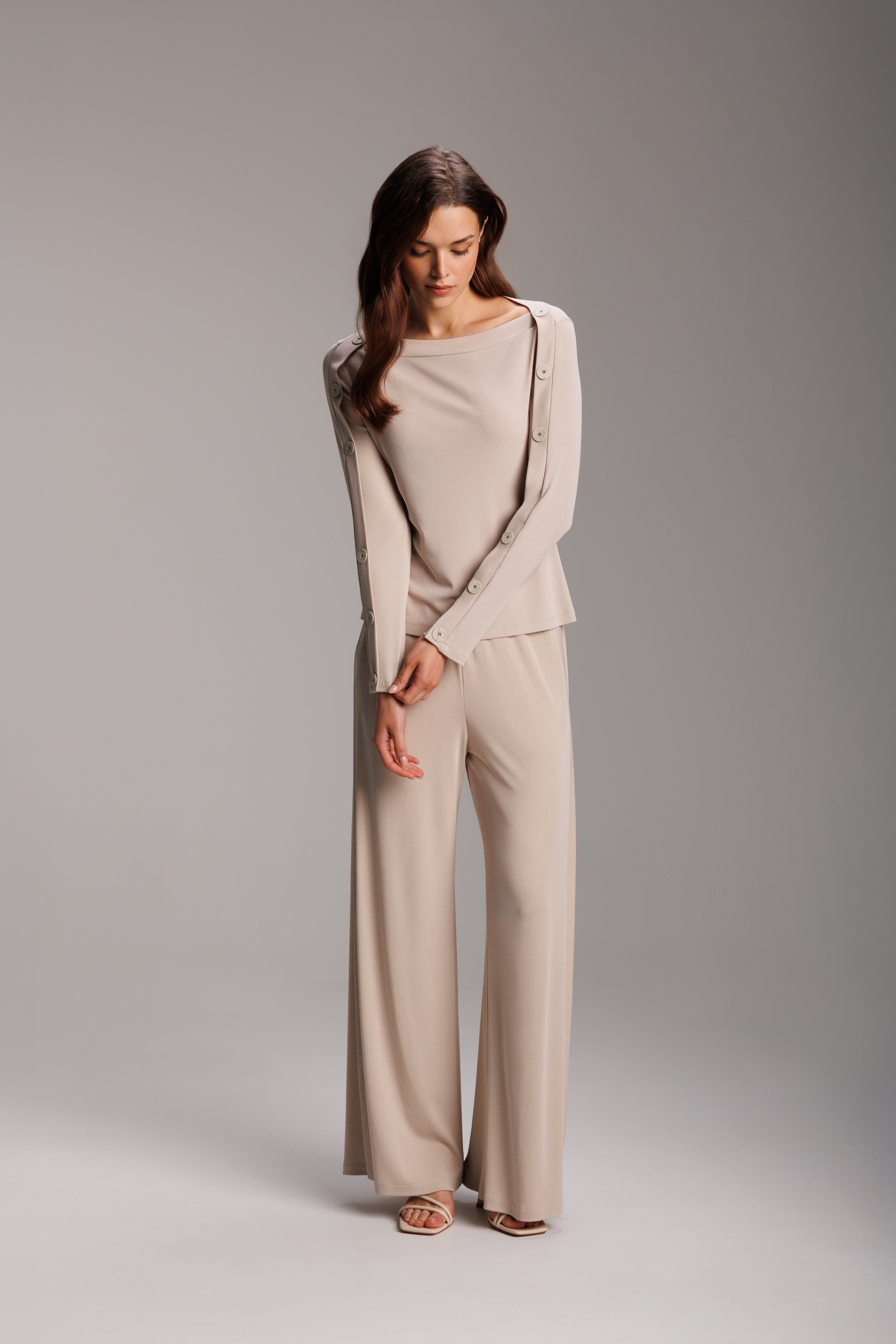 The Lirena sweater, made of soft, high-quality viscose knit, captivates with its subtlety and modern lines. The refined shade of light beige lends the piece a lightness and timeless elegance. A distinctive design element is the decorative pleat running along the shoulders to the neckline, adorned with striking matte buttons that give the sweater a unique character. The simple, slightly fitted cut ensures comfort and drapes beautifully on the figure. This piece easily fits the "quiet luxury" style: minimalist, yet with refined, eye-catching detail.