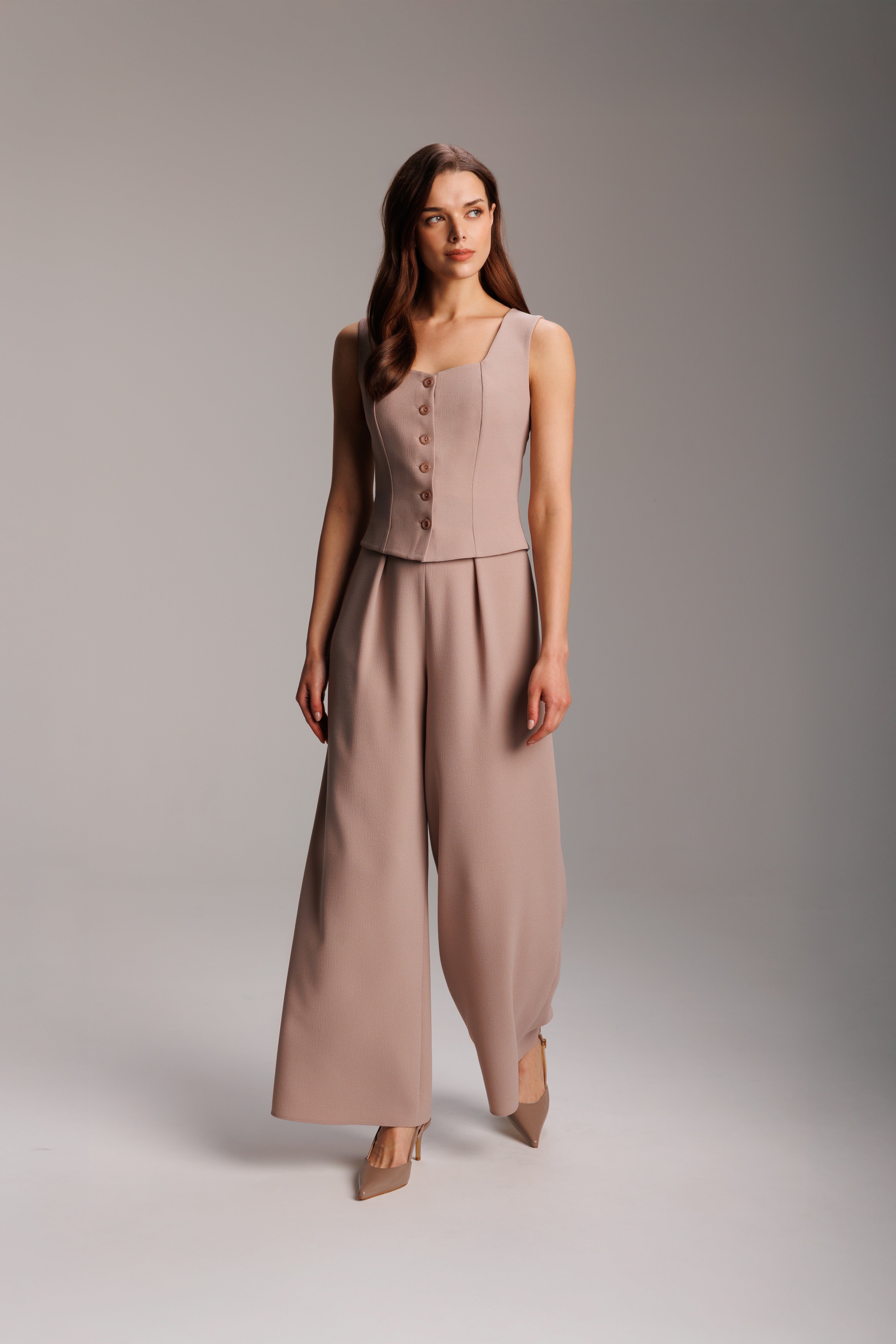 Wysoki stan, mocno dopasowany w talii, pięknie podkreśla kobiecą linię, modelując proporcje i wydłużając optycznie nogi. Zakładki z przodu dodają przestrzeni, a zamek z tyłu zachowuje czystość formy z przodu, dzięki czemu spodnie prezentują się niezwykle szlachetnie.