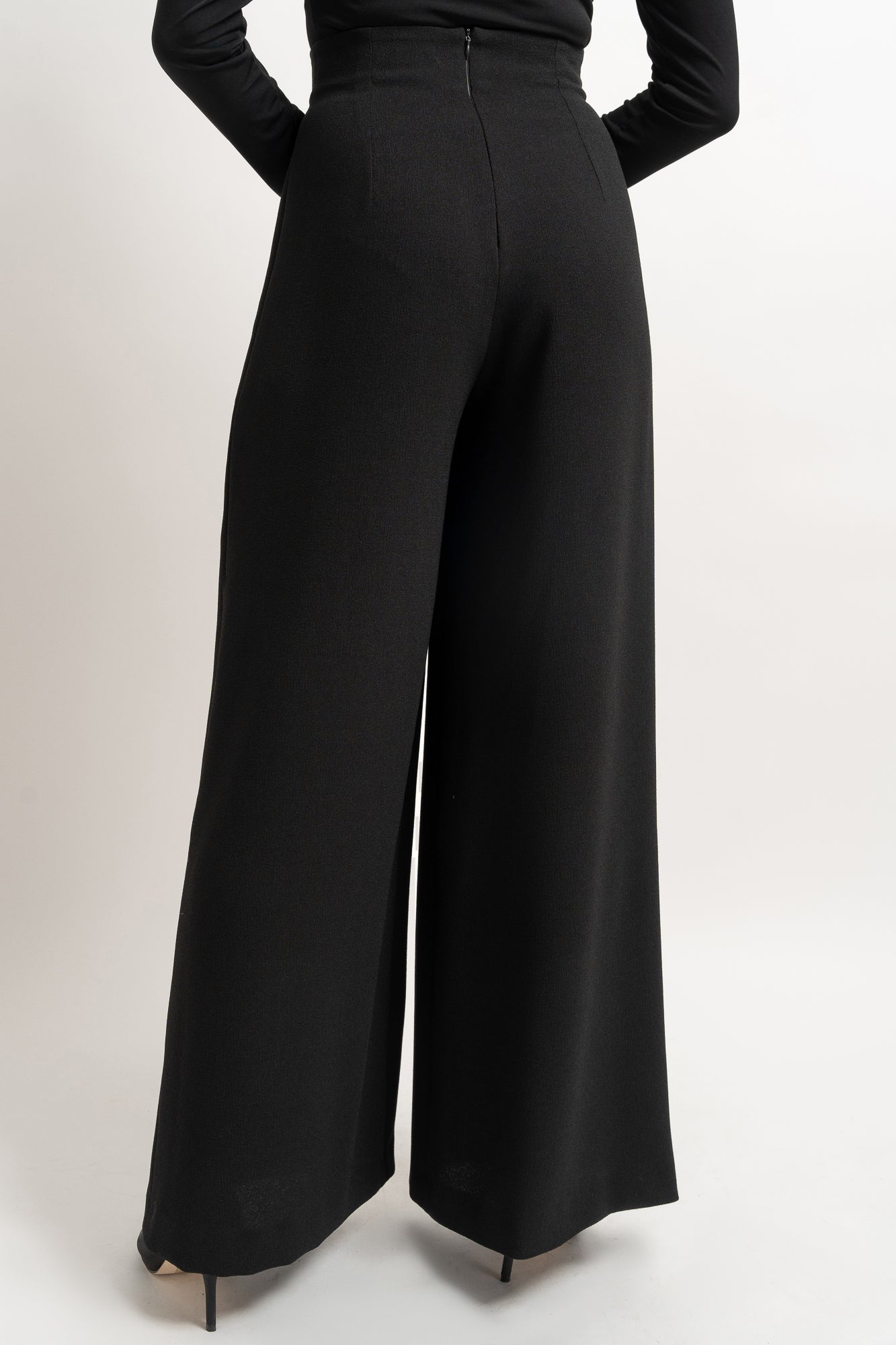 Wysoki stan, mocno dopasowany w talii, pięknie podkreśla kobiecą linię, modelując proporcje i wydłużając optycznie nogi. Zakładki z przodu dodają przestrzeni, a zamek z tyłu zachowuje czystość formy z przodu, dzięki czemu spodnie prezentują się niezwykle szlachetnie.