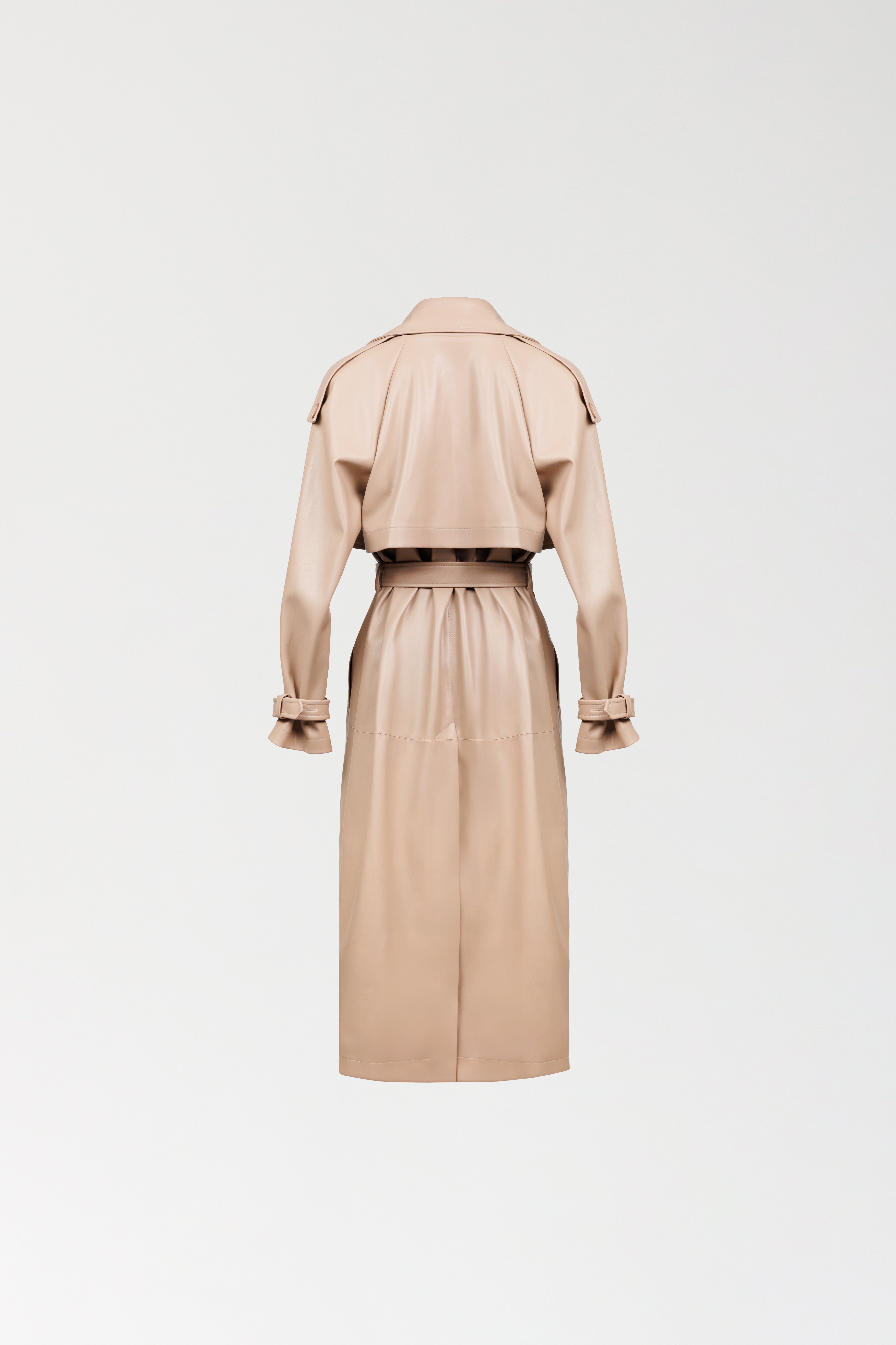 Trencz o dopracowanym kroju i długości maxi, wykonany z miękkiej skóry syntetycznej o subtelnym, satynowym połysku. Klasyczna forma zyskała współczesny charakter dzięki szerokim klapom, pagonom, wiązaniu w talii oraz dodatkowej patce z przodu i karczkowi na plecach.