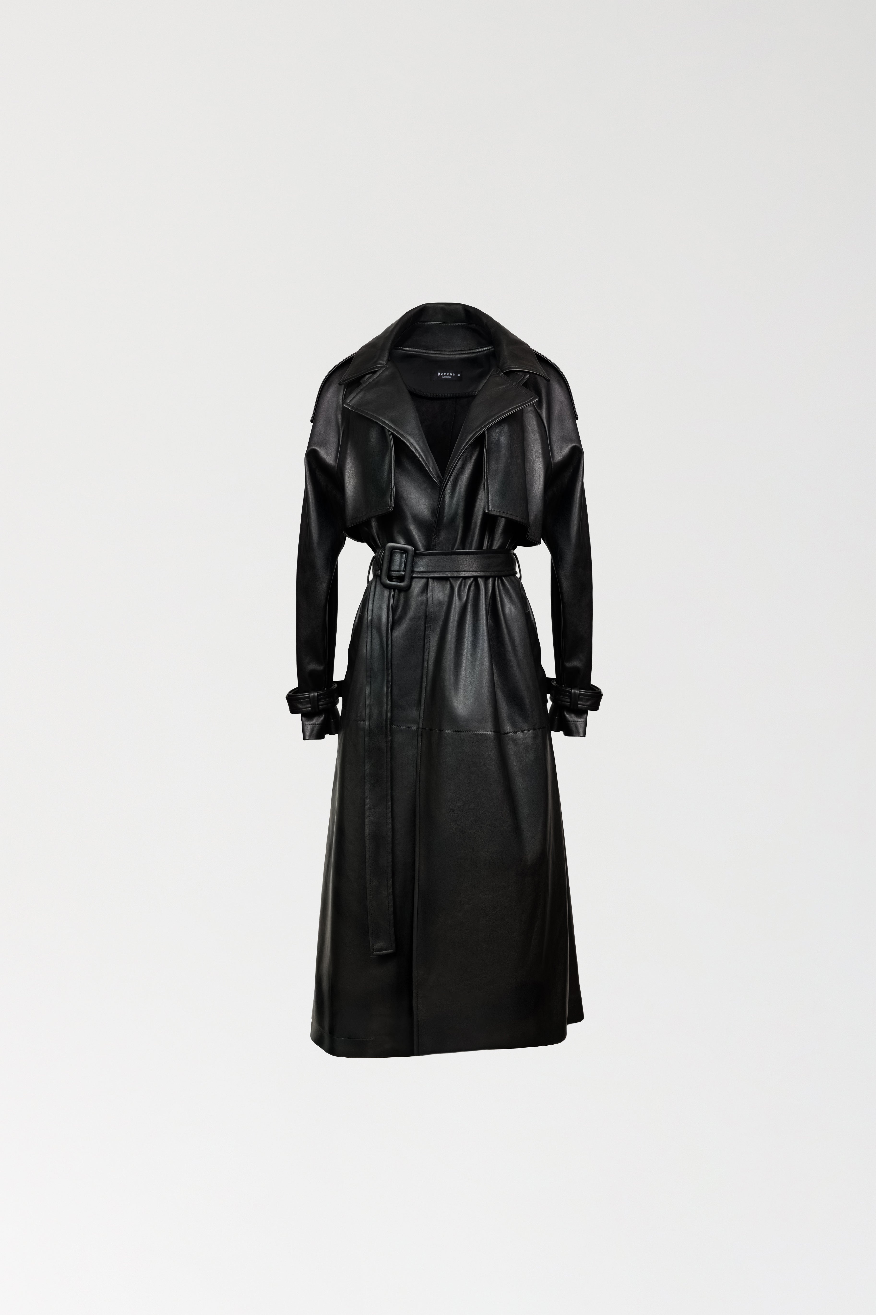 Trencz o dopracowanym kroju i długości maxi, wykonany z miękkiej skóry syntetycznej o subtelnym, satynowym połysku. Klasyczna forma zyskała współczesny charakter dzięki szerokim klapom, pagonom, wiązaniu w talii oraz dodatkowej patce z przodu i karczkowi na plecach.