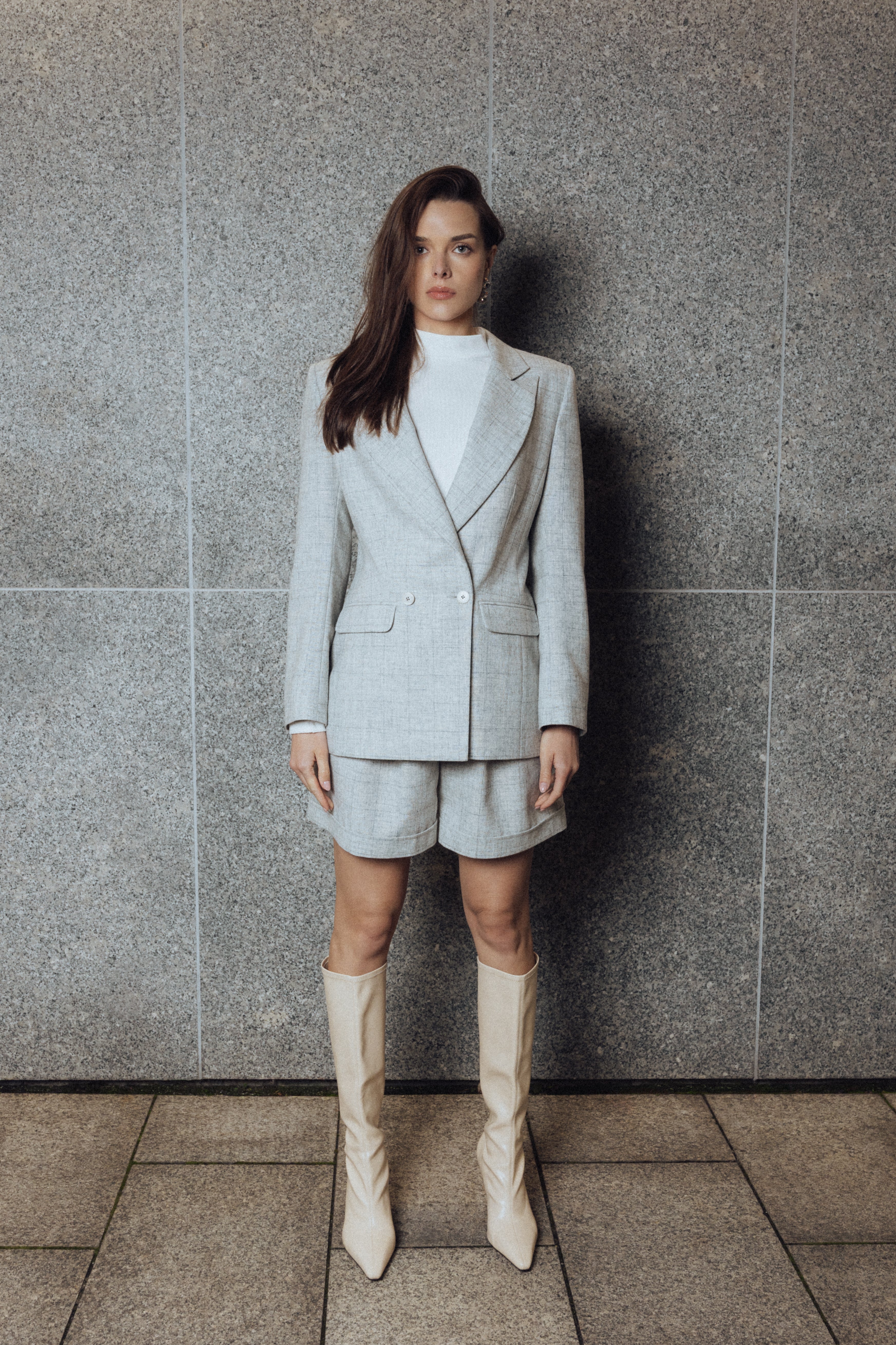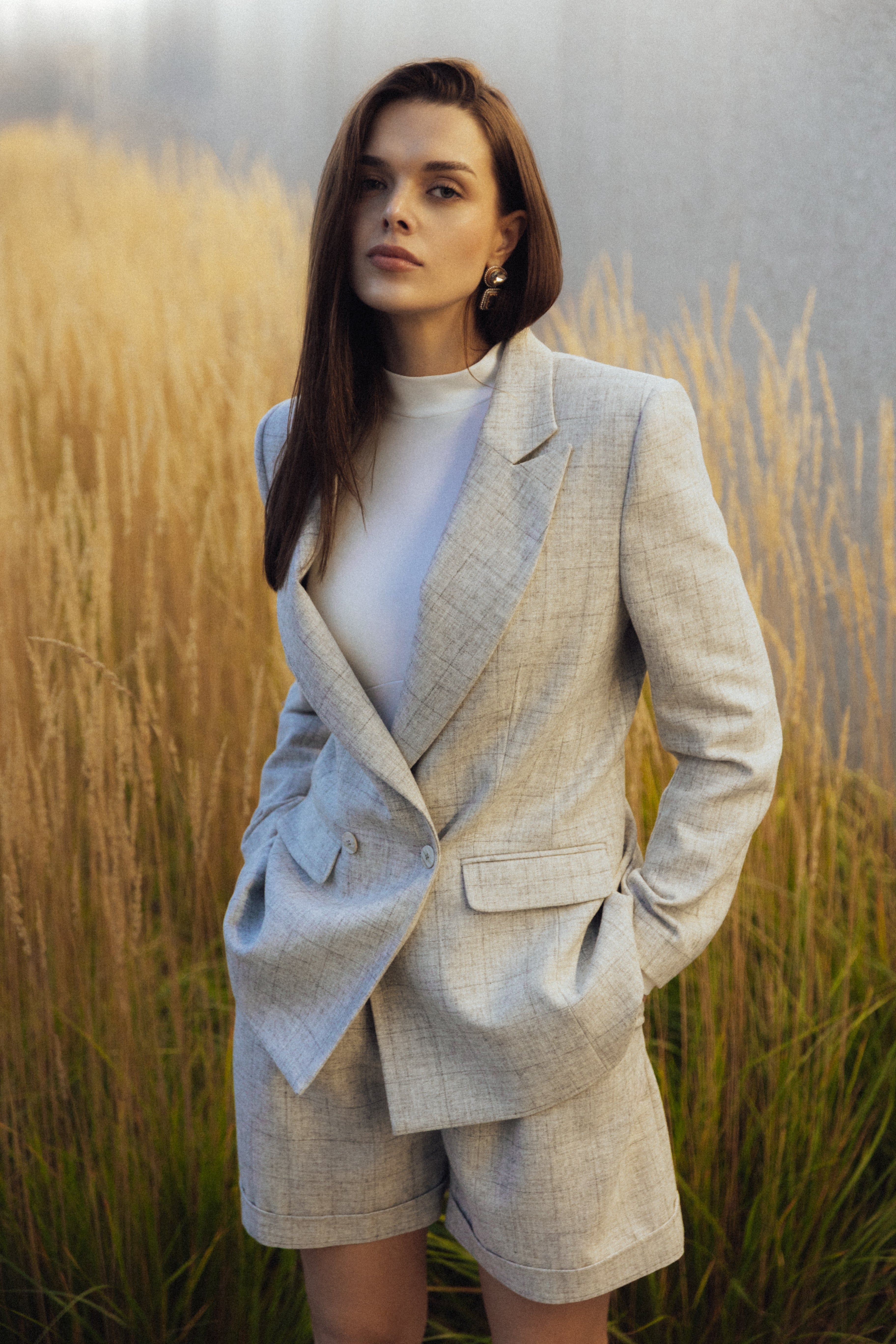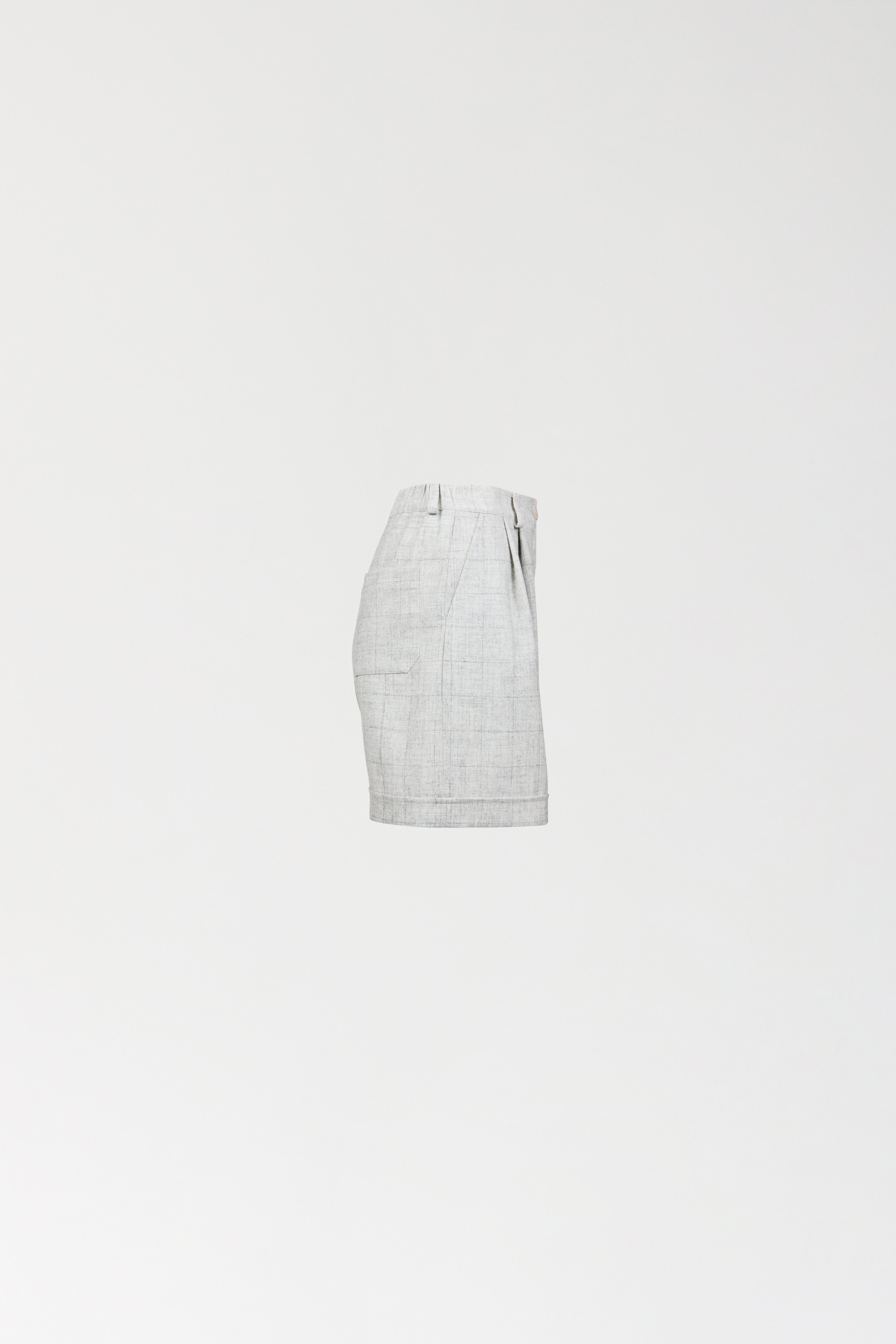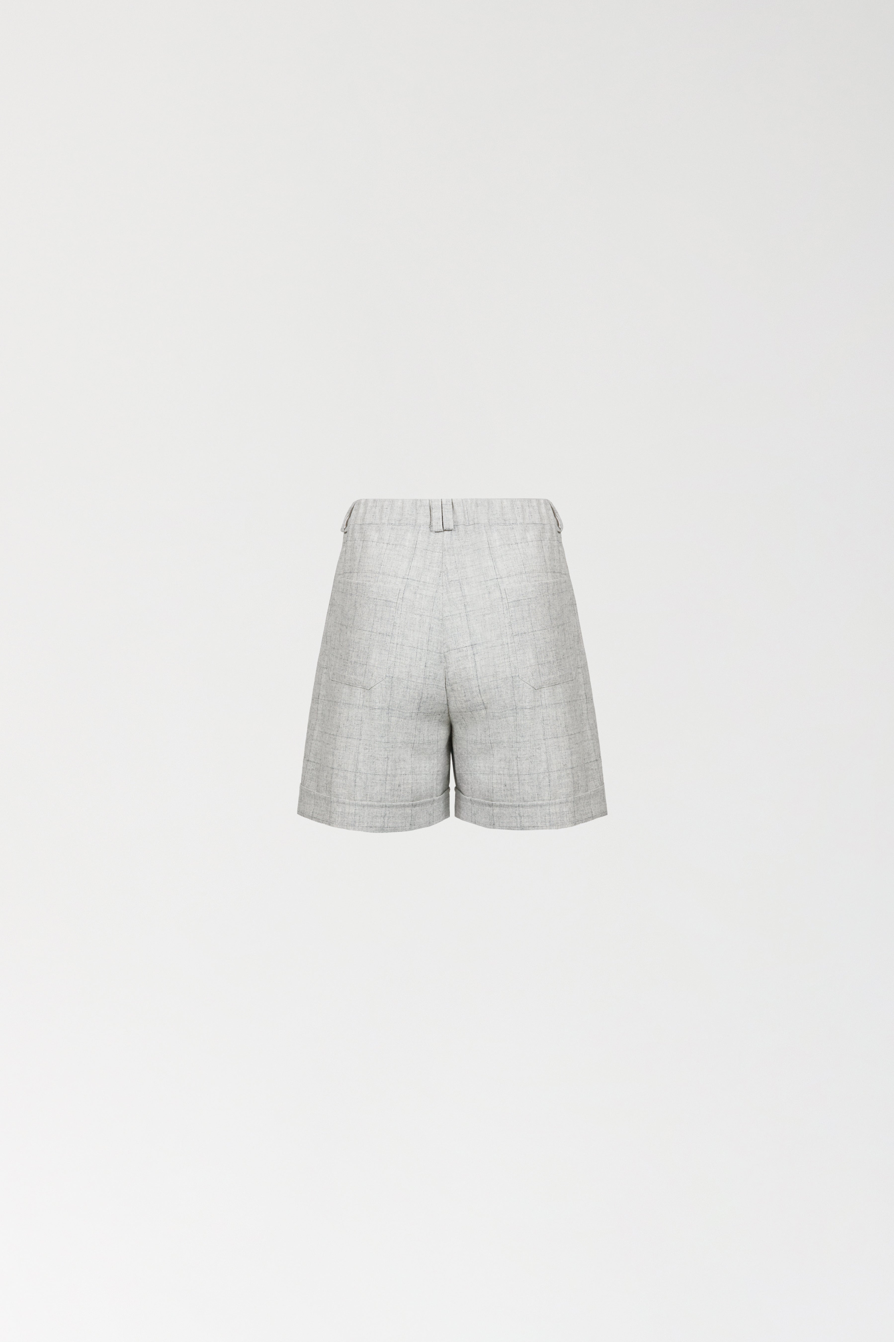 Shorty o dopracowanej, lekko podwyższonej talii z charakterystycznym załamaniem linii w okolicy zaszewek oraz wywiniętym dołem nogawki, co porządkuje proporcje i nadaje sylwetce lekkość. Melanżowa kratka pozostaje subtelna i czytelna, dzięki czemu model dobrze odnajduje się zarówno w zestawach codziennych, jak i w bardziej uporządkowanych stylizacjach z koszulą lub lekkim topem.